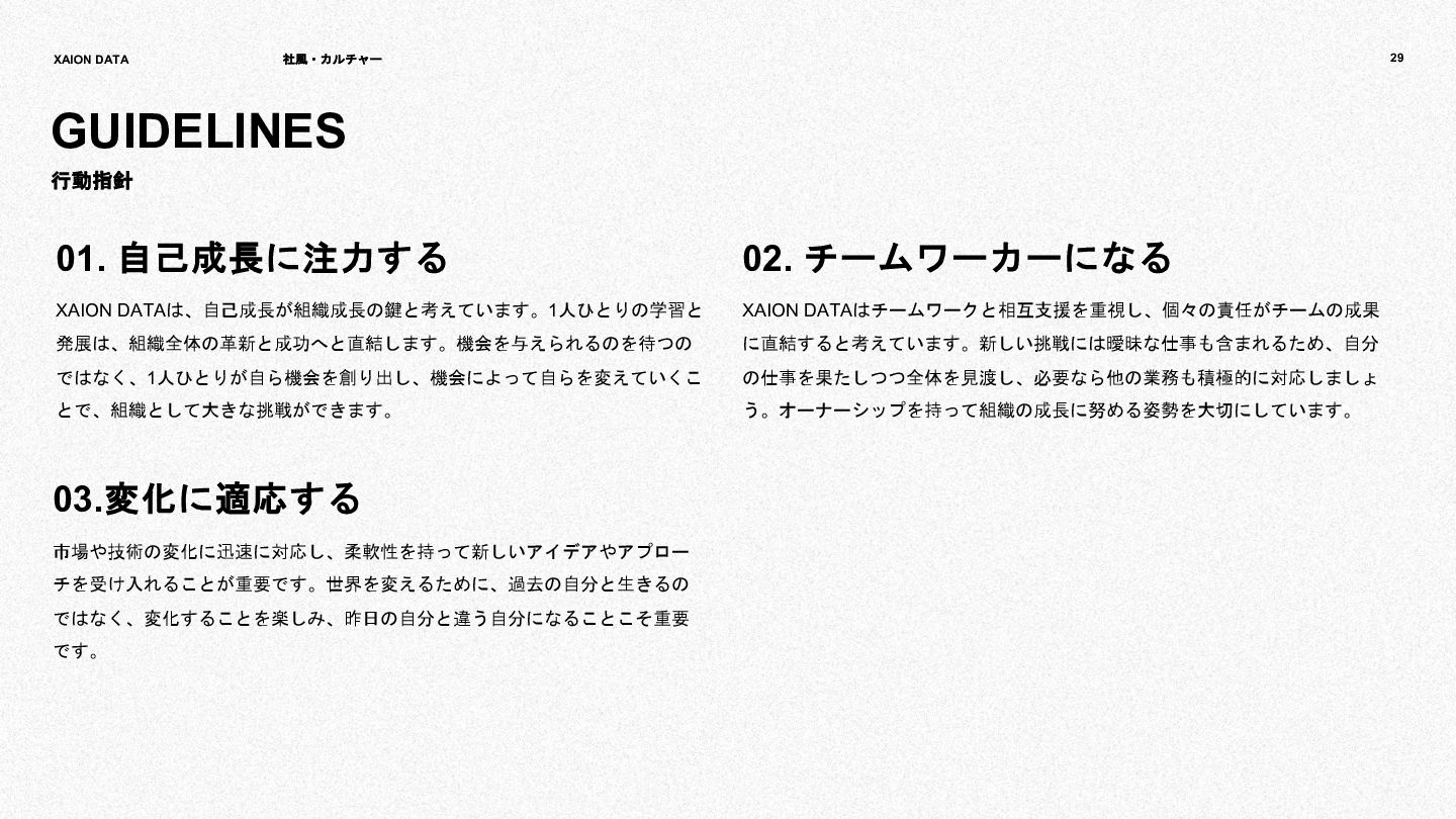 「コト」に向き合う。自分の弱さや課題に向き合う。何事も誠実に向き合 うことが、信頼の獲得と自身の成長につながる。 ・倫理観(モラリズム、ナイスな人)のある企業文化 ・「ヒト」、「コト」に向き合い自己成長する企業文化 02. Be a Professional オーナーシップを持って行動し、自身の結果だけではなく組織の結果も踏 まえて最高の成果を目指す。プロフェッショナルとして、全ての仕事に対 して当たり前のレベルを高く持つ。常にお客様の期待を超えるものを提供 し、最高の体験を届ける組織であれ。 ・プロフェッショナルとしての自己成長 ・個人だけでなく組織の成功を目指し、オーナーシップを持つ企業文化 03. Respect the Difference 自分の信念を大事にしつつも、常に相手と自分の違いを考え・尊重する。 「自分が正しい」と強く信じている時こそ、相手から見えている景色を無 視しがちである。多様な価値観の共存がより強い組織を作る。 ・己を知り、他者を知ることで、リスペクトをしあえる企業文化 04. Go Beyond 新しいアイデアやテクノロジーへの挑戦、高い目標へのチャレンジへ賞賛 を。全員が前例にとらわれず、大胆かつ情熱的な挑戦を続け、失敗から学 びを得ることで創造的なイノベーションを実現していく。現状維持は衰退 である。 ・高いチャレンジと新しいことへの挑戦、およびそれを推奨する組織文化 ・進化と変革を追求する企業文化