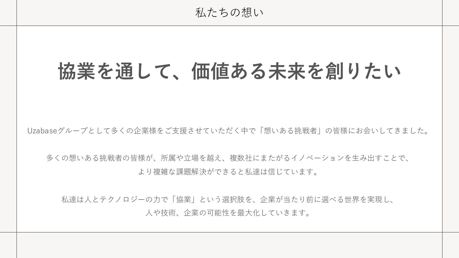 協業を通して、価値ある未来を創りたい Uzabaseグループとして多くの企業様をご⽀援させていただく中で「想いある挑戦者」の皆様にお会いしてきました。 多くの想いある挑戦者の皆様が、所属や⽴場を越え、複数社にまたがるイノベーションを⽣み出すことで、 より複雑な課題解決ができると私達は信じています。 私達は⼈とテクノロジーの⼒で「協業」という選択肢を、企業が当たり前に選べる世界を実現し、 ⼈や技術、企業の可能性を最⼤化していきます。 私たちの想い