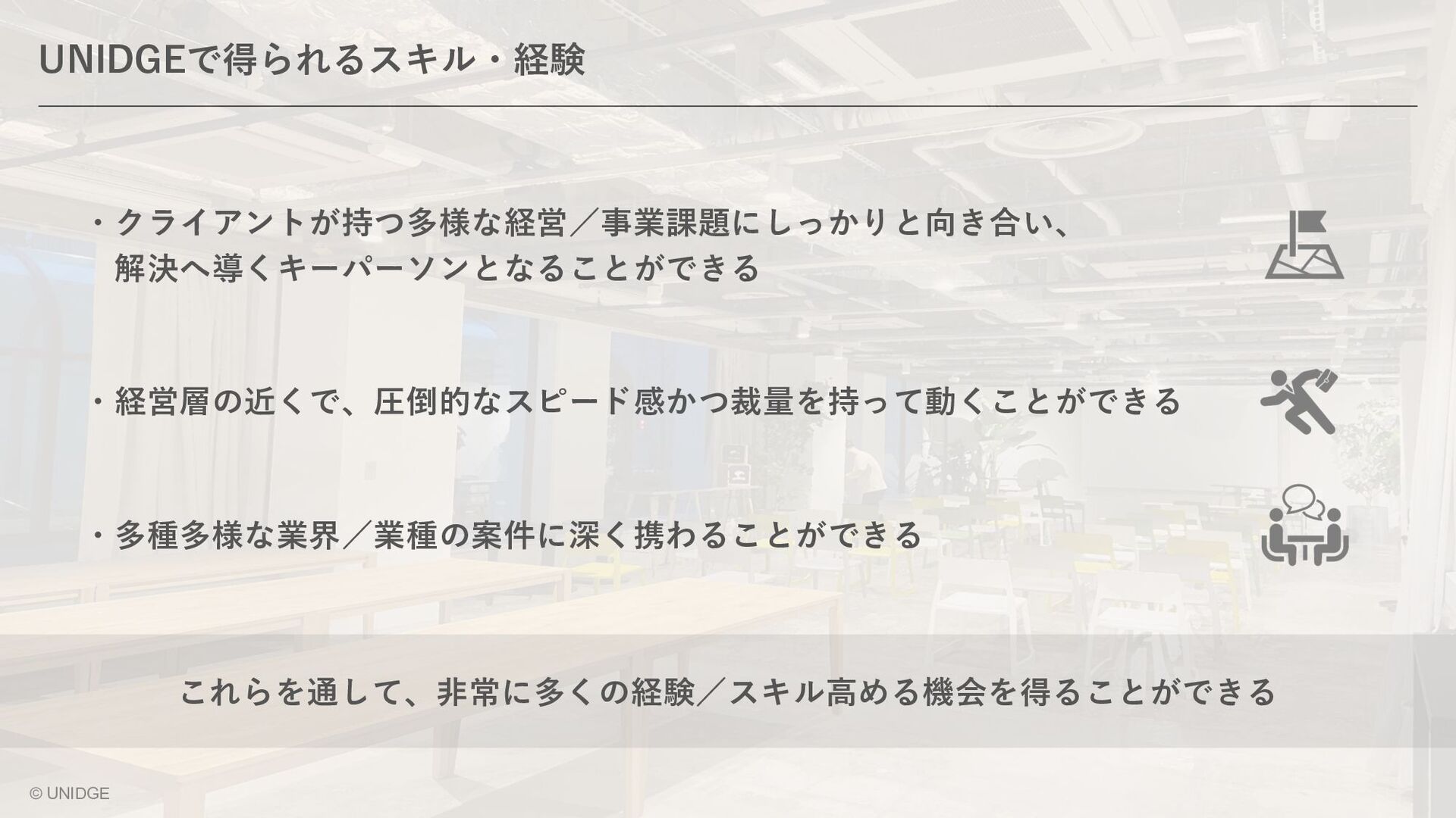 ・クライアントが持つ多様な経営/事業課題にしっかりと向き合い、 解決へ導くキーパーソンとなることができる ・経営層の近くで、圧倒的なスピード感かつ裁量を持って動くことができる ・多種多様な業界/業種の案件に深く携わることができる UNIDGEで得られるスキル・経験 © UNIDGE これらを通して、⾮常に多くの経験/スキル⾼める機会を得ることができる