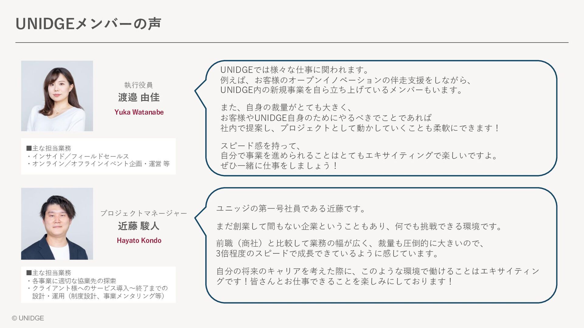 ・クライアント様へのサービス導⼊〜終了までの 設計・運⽤(制度設計、事業メンタリング等) ユニッジの第⼀号社員である近藤です。 まだ創業して間もない企業ということもあり、何でも挑戦できる環境です。 前職(商社)と⽐較して業務の幅が広く、裁量も圧倒的に⼤きいので、 3倍程度のスピードで成⻑できているように感じています。 ⾃分の将来のキャリアを考えた際に、このような環境で働けることはエキサイティン グです!皆さんとお仕事できることを楽しみにしております! 渡邉 由佳 Yuka Watanabe 執⾏役員 ▪主な担当業務 ・インサイド/フィールドセールス ・オンライン/オフラインイベント企画・運営 等 UNIDGEでは様々な仕事に関われます。 例えば、お客様のオープンイノベーションの伴⾛⽀援をしながら、 UNIDGE内の新規事業を⾃ら⽴ち上げているメンバーもいます。 また、⾃⾝の裁量がとても⼤きく、 お客様やUNIDGE⾃⾝のためにやるべきでことであれば 社内で提案し、プロジェクトとして動かしていくことも柔軟にできます! スピード感を持って、 ⾃分で事業を進められることはとてもエキサイティングで楽しいですよ。 ぜひ⼀緒に仕事をしましょう!