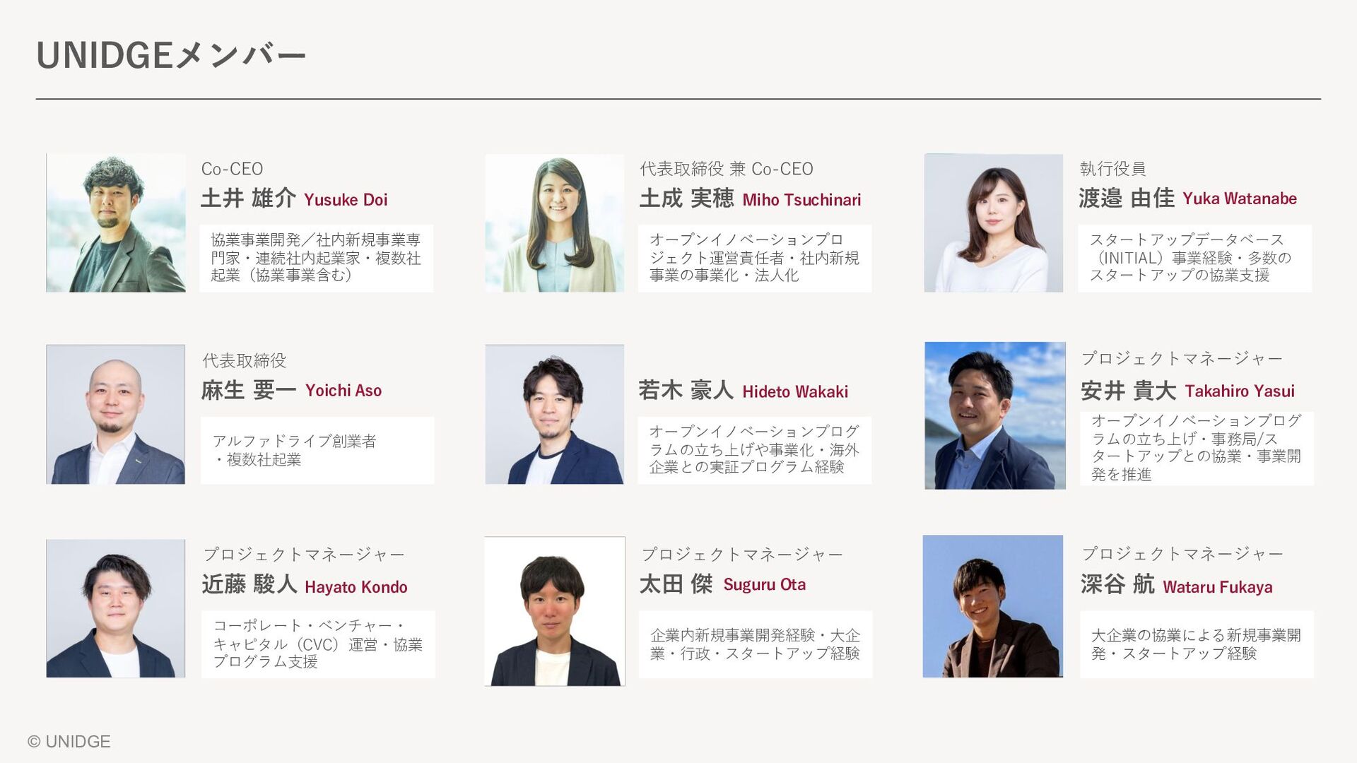 オープンイノベーションプログ ラムの⽴ち上げ・事務局/ス タートアップとの協業・事業開 発を推進 安井 貴⼤ Takahiro Yasui オープンイノベーションプログ ラムの⽴ち上げや事業化・海外 企業との実証プログラム経験 若⽊ 豪⼈ Hideto Wakaki スタートアップデータベース (INITIAL)事業経験・多数の スタートアップの協業⽀援 渡邉 由佳 Yuka Watanabe 執⾏役員 協業事業開発/社内新規事業専 ⾨家・連続社内起業家・複数社 起業(協業事業含む) Co-CEO ⼟井 雄介 Yusuke Doi オープンイノベーションプロ ジェクト運営責任者・社内新規 事業の事業化・法⼈化 代表取締役 兼 Co-CEO ⼟成 実穂 Miho Tsuchinari コーポレート・ベンチャー・ キャピタル(CVC)運営・協業 プログラム⽀援 近藤 駿⼈ Hayato Kondo 企業内新規事業開発経験・⼤企 業・⾏政・スタートアップ経験 太⽥ 傑 Suguru Ota プロジェクトマネージャー ⼤企業の協業による新規事業開 発・スタートアップ経験 深⾕ 航 Wataru Fukaya プロジェクトマネージャー プロジェクトマネージャー プロジェクトマネージャー
