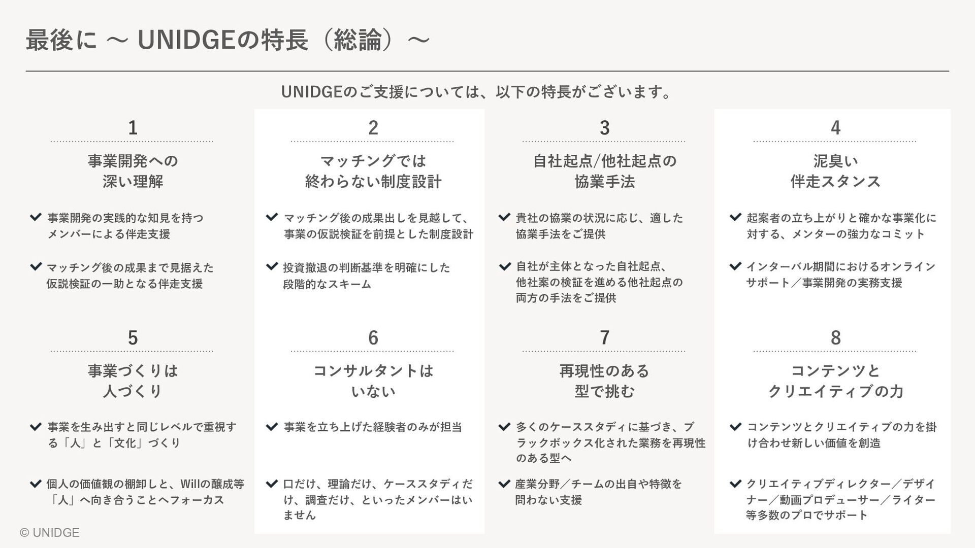 最後に 〜 UNIDGEの特⻑(総論)〜 © UNIDGE UNIDGEのご⽀援については、以下の特⻑がございます。 事業開発への 深い理解 1 マッチングでは