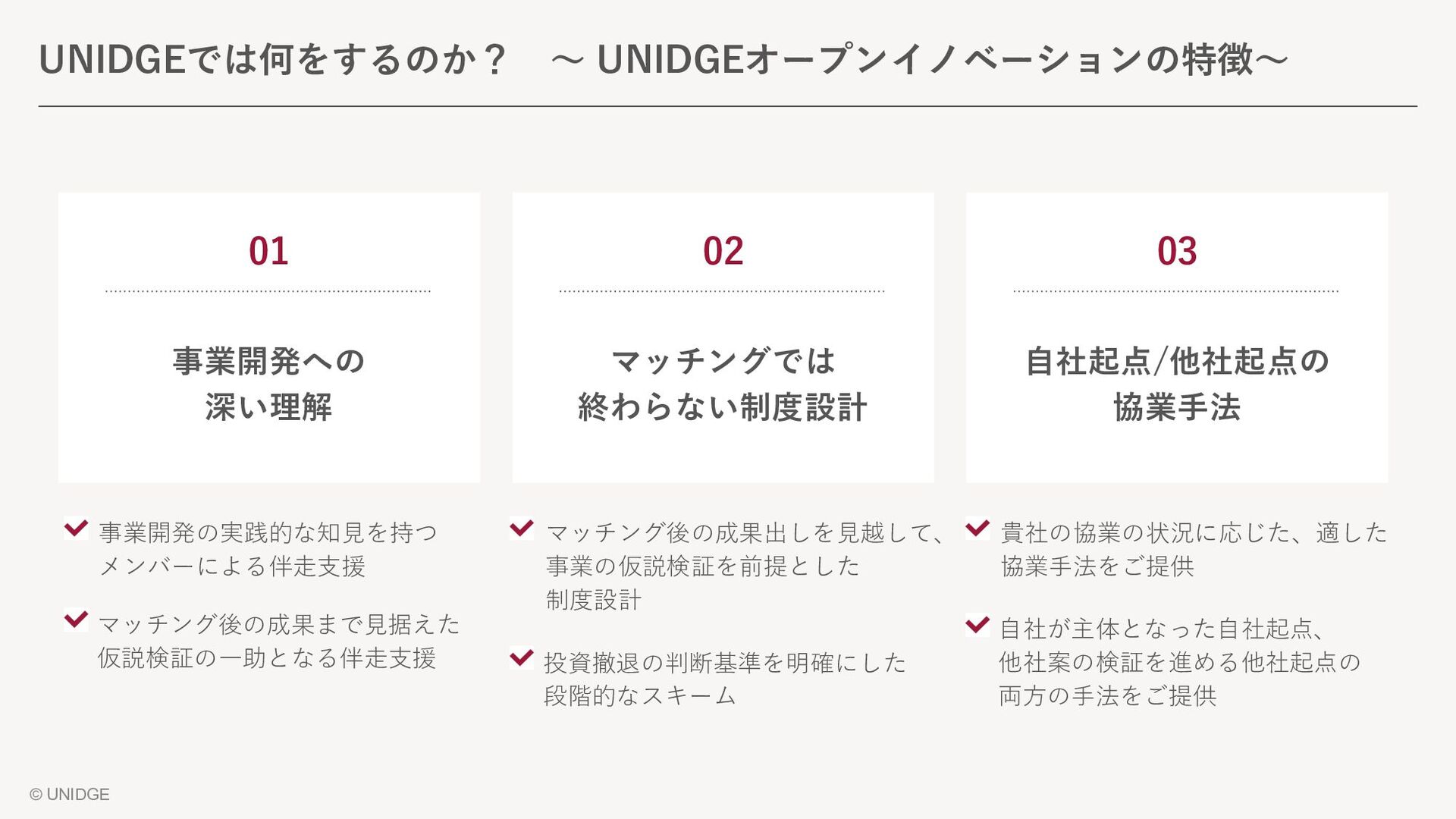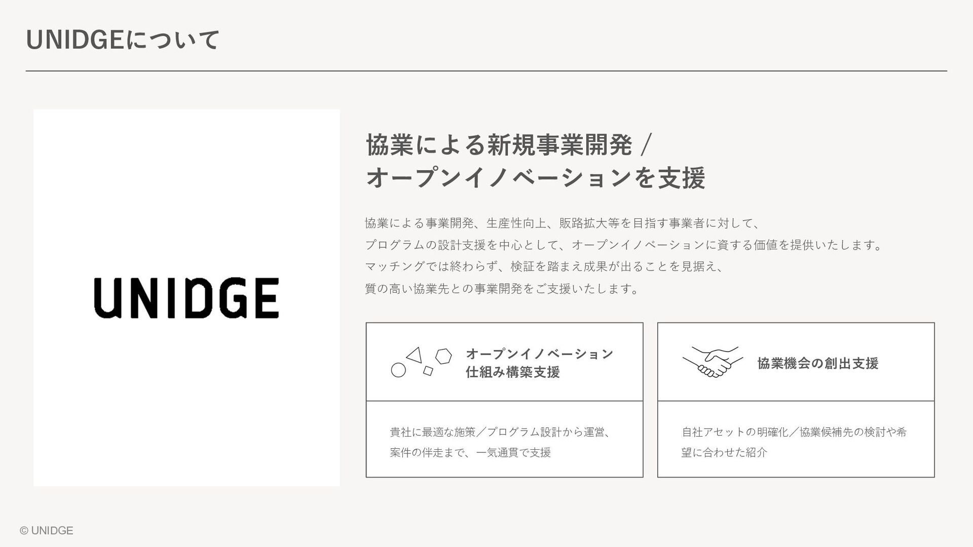 UNIDGEについて © UNIDGE 協業による新規事業開発 / オープンイノベーションを⽀援 協業による事業開発、⽣産性向上、販路拡⼤等を⽬指す事業者に対して、 プログラムの設計⽀援を中⼼として、オープンイノベーションに資する価値を提供いたします。 マッチングでは終わらず、検証を踏まえ成果が出ることを⾒据え、 質の⾼い協業先との事業開発をご⽀援いたします。