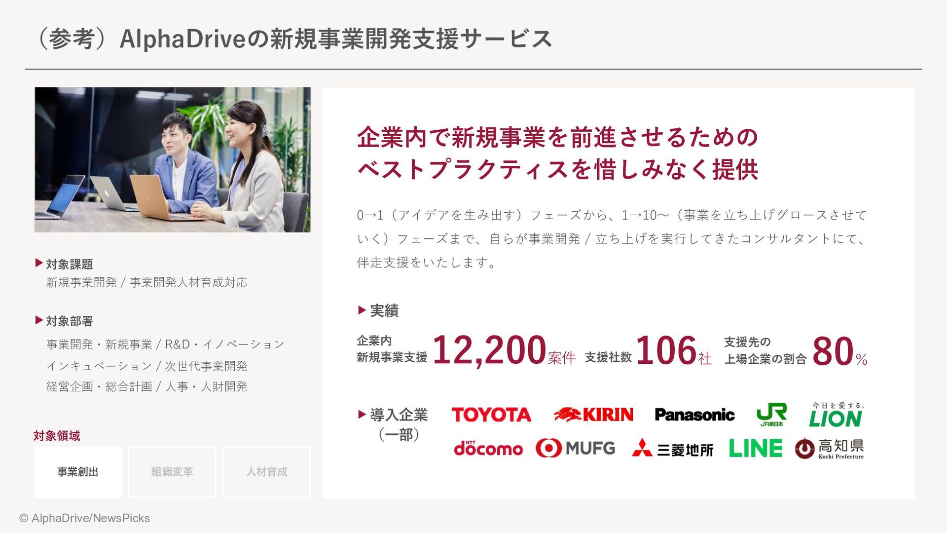 (参考)AlphaDriveの新規事業開発⽀援サービス © AlphaDrive/NewsPicks 事業創出 組織変⾰ ⼈材育成 対象課題 新規事業開発 / 事業開発⼈材育成対応