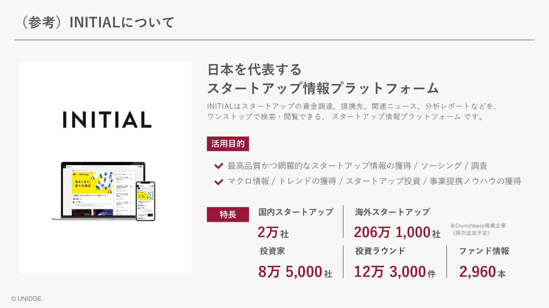 © UNIDGE (参考)INITIALについて 2万 投資家 海外スタートアップ ※Crunchbase掲載企業 (順次追加予定) ⽇本を代表する スタートアップ情報プラットフォーム