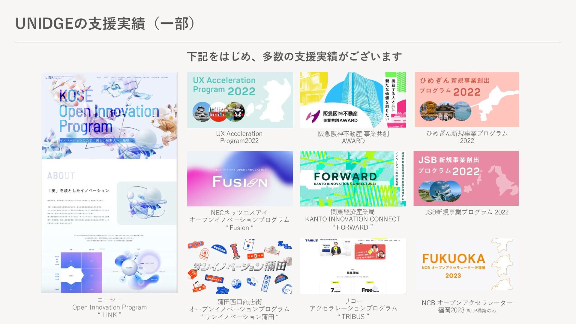 UNIDGEの⽀援実績(⼀部) UX Acceleration Program2022 コーセー Open Innovation Program “ LINK