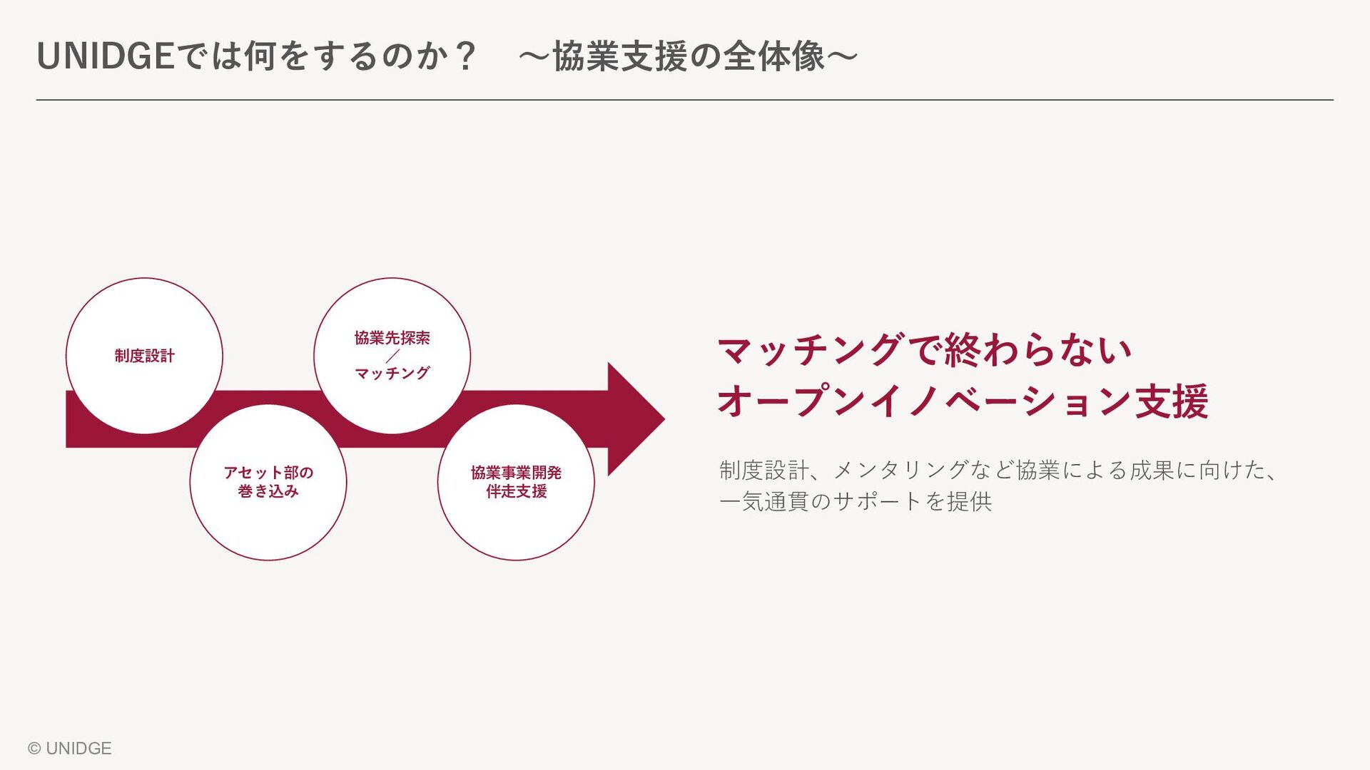 UNIDGEでは何をするのか? 〜協業⽀援の全体像〜 © UNIDGE 制度設計、メンタリングなど協業による成果に向けた、 ⼀気通貫のサポートを提供 マッチングで終わらない オープンイノベーション⽀援 制度設計 アセット部の