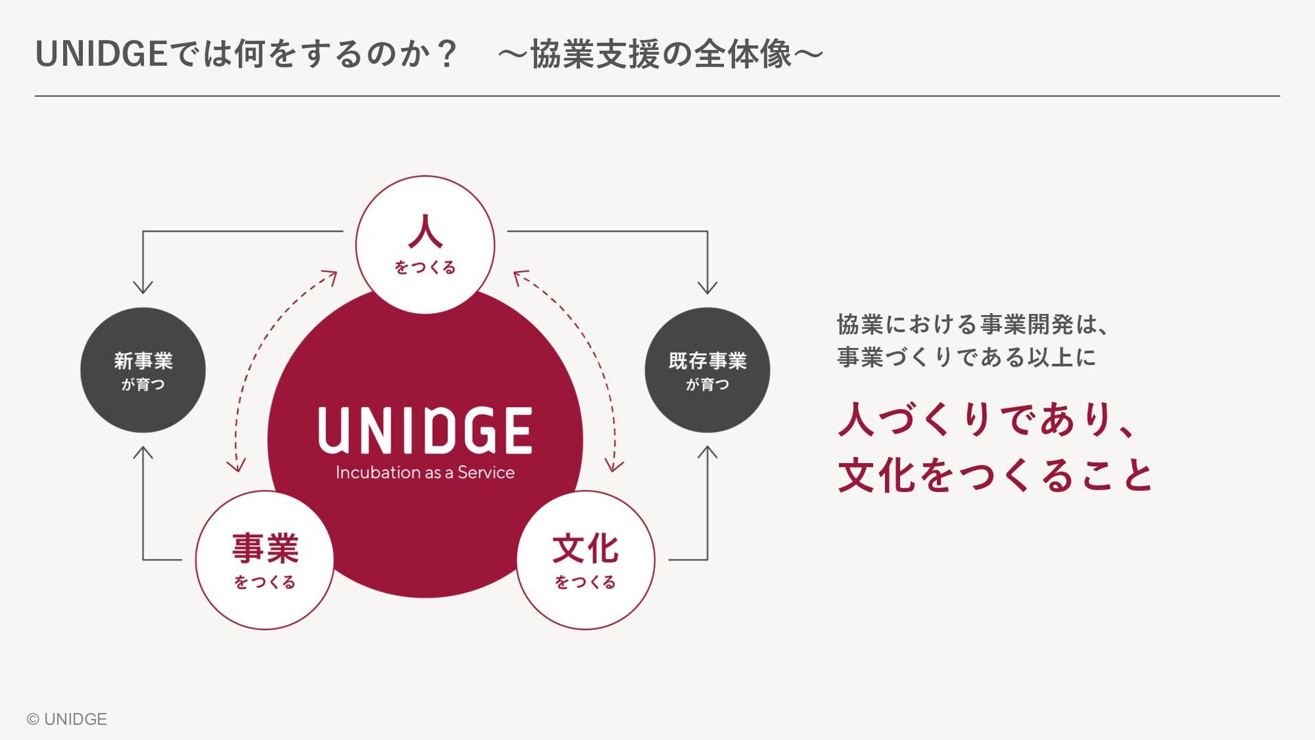 UNIDGEでは何をするのか? 〜協業⽀援の全体像〜 © UNIDGE 協業における事業開発は、 事業づくりである以上に ⼈づくりであり、 ⽂化をつくること