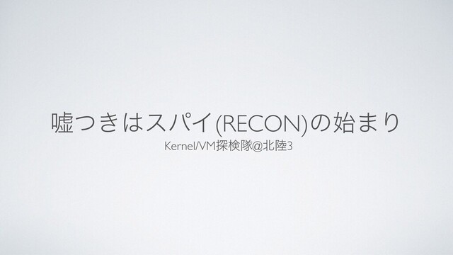 Kernel/VM探検隊@北陸3でLTさせていただいた 「嘘つきはスパイ(Recon)の始まり」です。 https://connpass.com/event/65224/ https://twitter.com/hiww