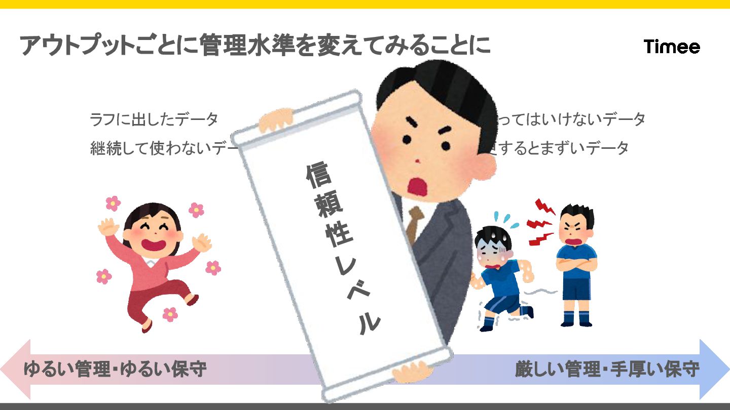 アウトプットごとに管理水準を変えてみることに ラフに出したデータ 継続して使わないデータ 間違ってはいけないデータ 変更するとまずいデータ ゆるい管理・ゆるい保守 厳しい管理・手厚い保守 信 頼 性