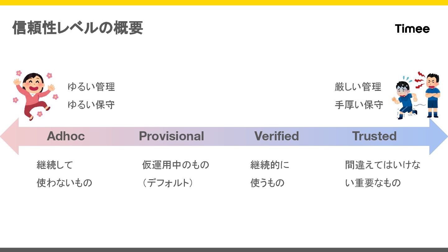 信頼性レベルの概要 Adhoc Provisional Verified Trusted 継続して 使わないもの 仮運用中のもの (デフォルト) 継続的に