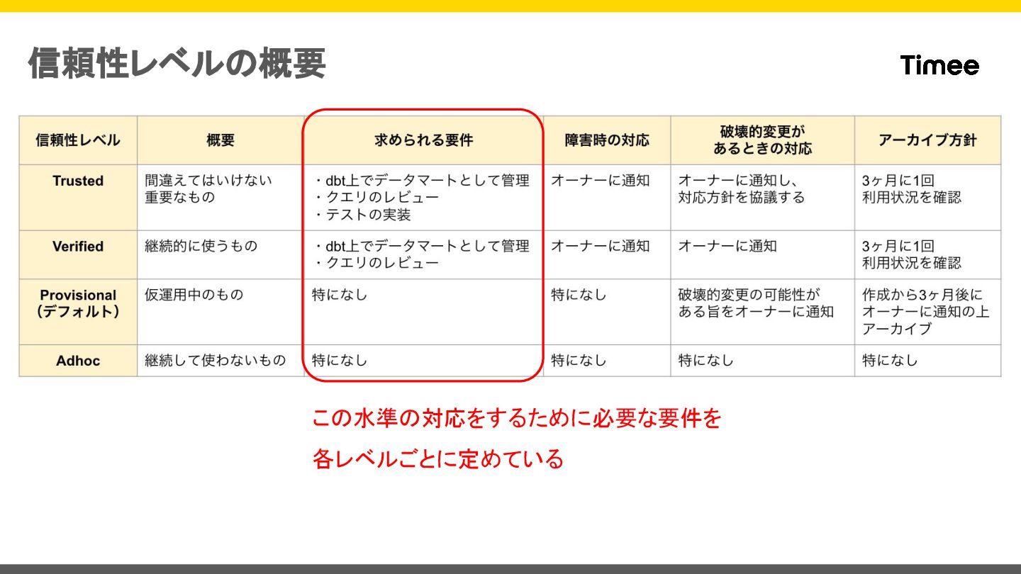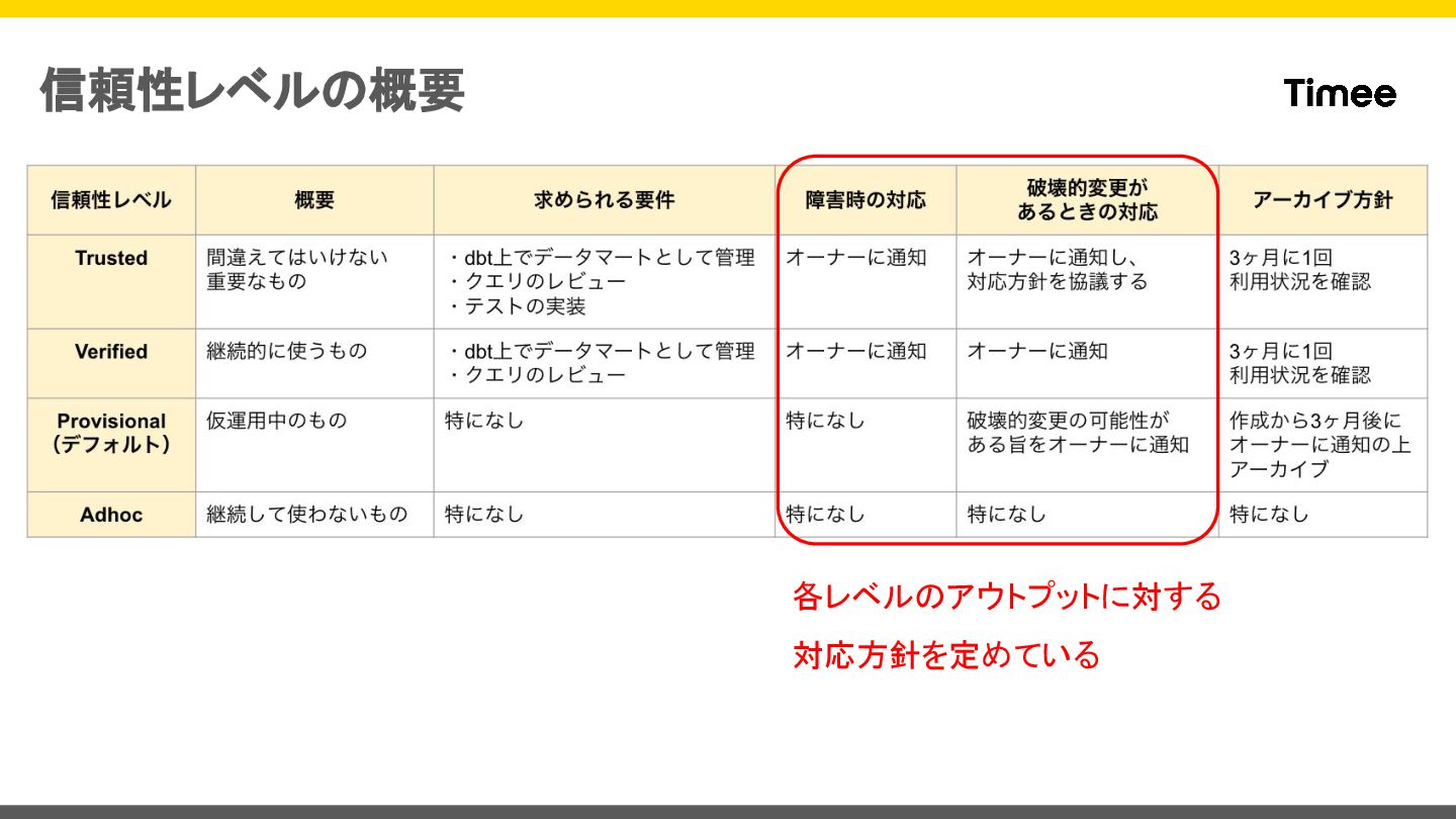 信頼性レベルの概要 使われていないアウトプットを守り続けなくて良いように、 定期的に利用確認やアーカイブ処理をしている