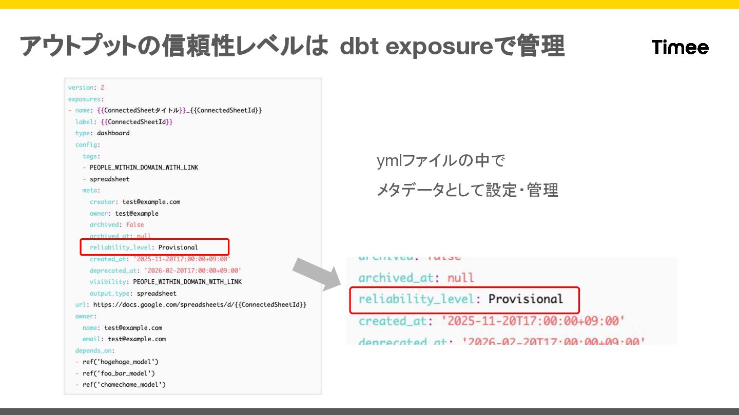 アウトプットの信頼性レベルは dbt exposureで管理 ymlファイルの中で メタデータとして設定・管理