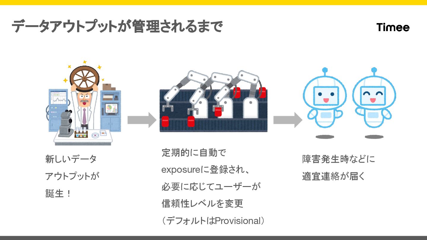 データアウトプットが管理されるまで 新しいデータ アウトプットが 誕生! 定期的に自動で exposureに登録され、 必要に応じてユーザーが 信頼性レベルを変更 (デフォルトはProvisional) 障害発生時などに