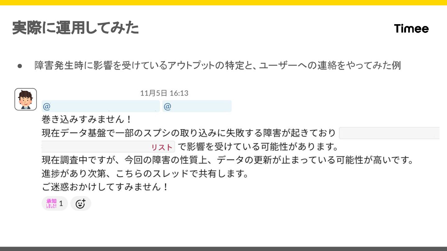 実際に運用してみた • 障害発生時に影響を受けているアウトプットの特定と、ユーザーへの連絡をやってみた例