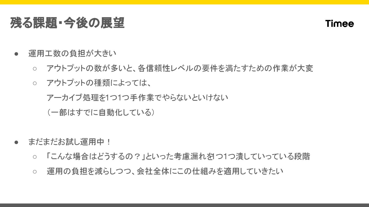 残る課題・今後の展望 • 運用工数の負担が大きい ◦ アウトプットの数が多いと、各信頼性レベルの要件を満たすための作業が大変 ◦ アウトプットの種類によっては、 アーカイブ処理を1つ1つ手作業でやらないといけない (一部はすでに自動化している) •