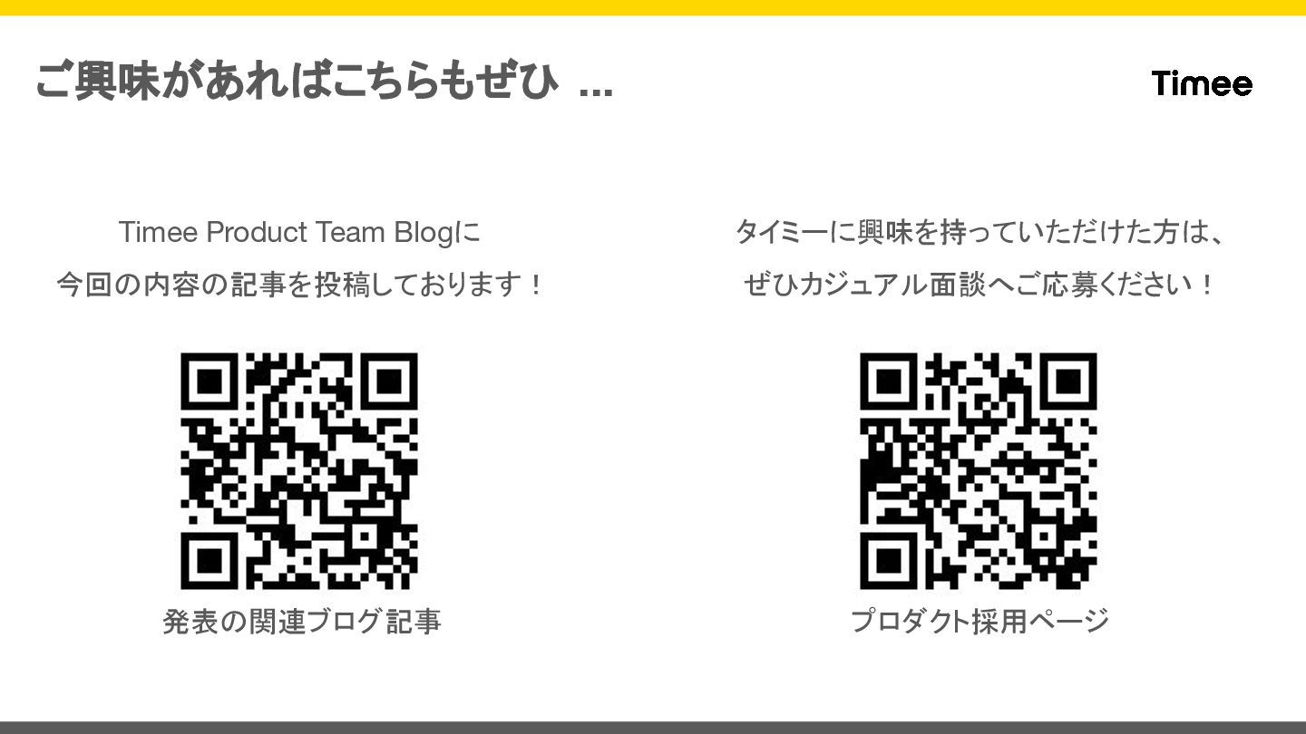 ご興味があればこちらもぜひ ... Timee Product Team Blogに 今回の内容の記事を投稿しております! 発表の関連ブログ記事 プロダクト採用ページ タイミーに興味を持っていただけた方は、