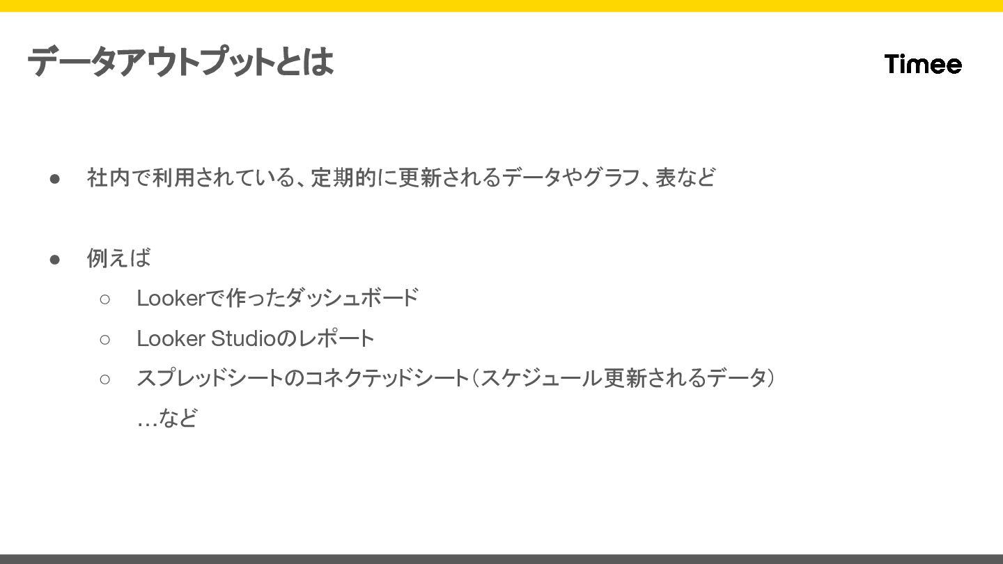 • 社内で利用されている、定期的に更新されるデータやグラフ、表など • 例えば ◦ Lookerで作ったダッシュボード ◦ Looker Studioのレポート ◦