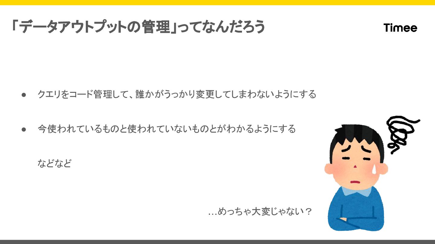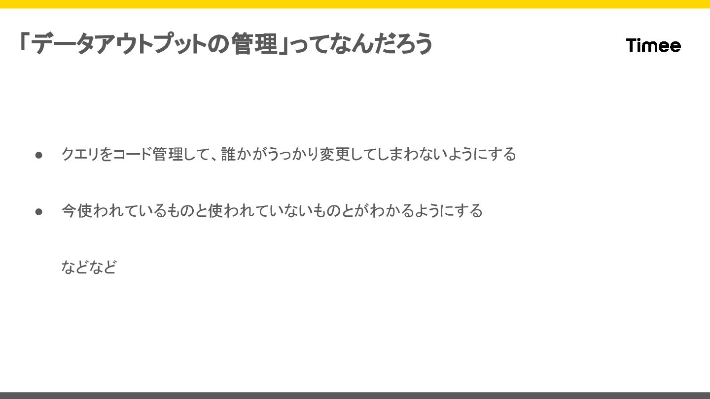 • クエリをコード管理して、誰かがうっかり変更してしまわないようにする • 今使われているものと使われていないものとがわかるようにする などなど 「データアウトプットの管理」ってなんだろう