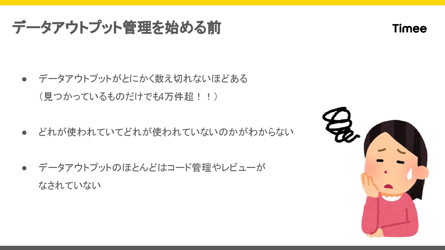 • データアウトプットがとにかく数え切れないほどある (見つかっているものだけでも4万件超!!) • どれが使われていてどれが使われていないのかがわからない • データアウトプットのほとんどはコード管理やレビューが なされていない データアウトプット管理を始める前