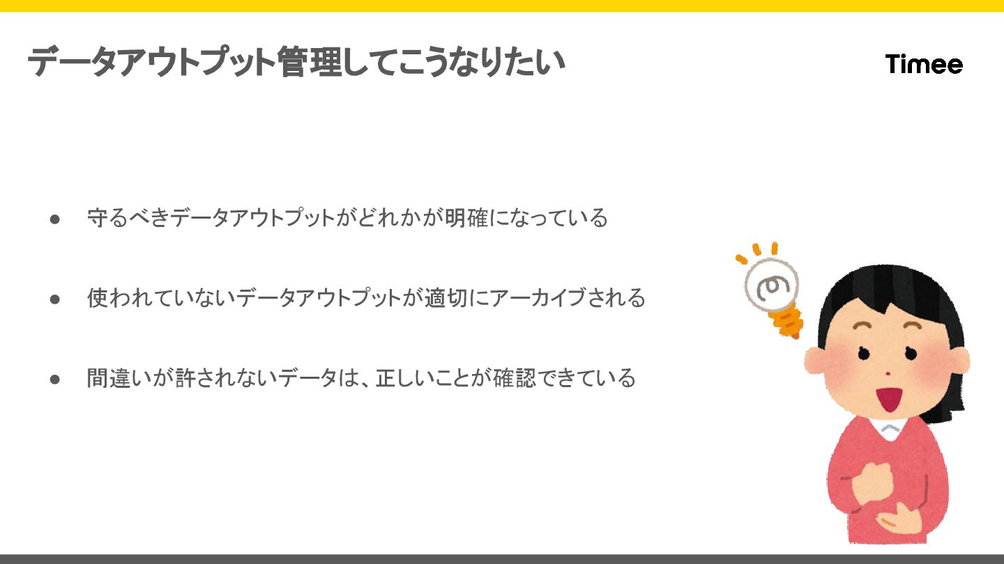 • 守るべきデータアウトプットがどれかが明確になっている • 使われていないデータアウトプットが適切にアーカイブされる • 間違いが許されないデータは、正しいことが確認できている データアウトプット管理してこうなりたい