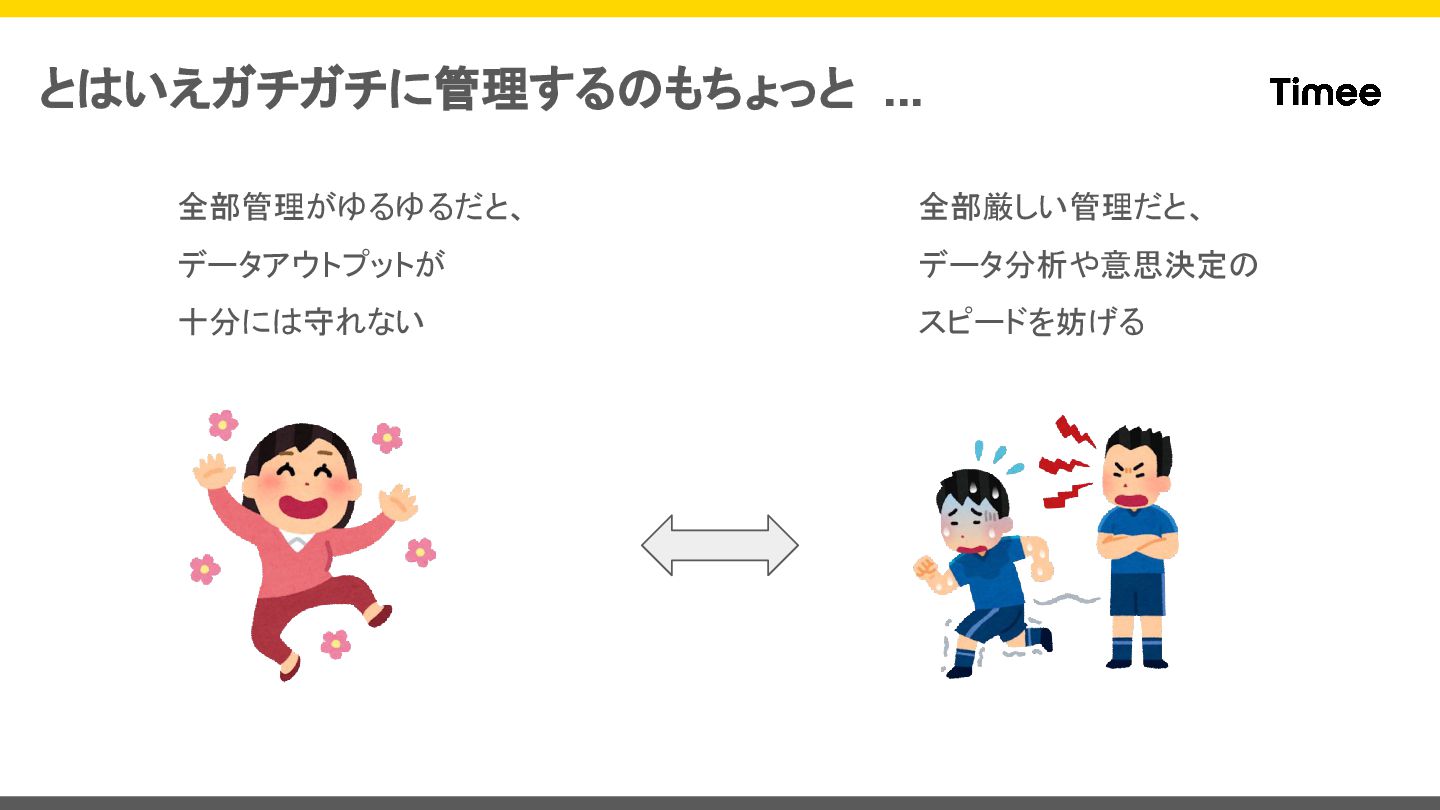 とはいえガチガチに管理するのもちょっと ... 全部管理がゆるゆるだと、 データアウトプットが 十分には守れない 全部厳しい管理だと、 データ分析や意思決定の スピードを妨げる