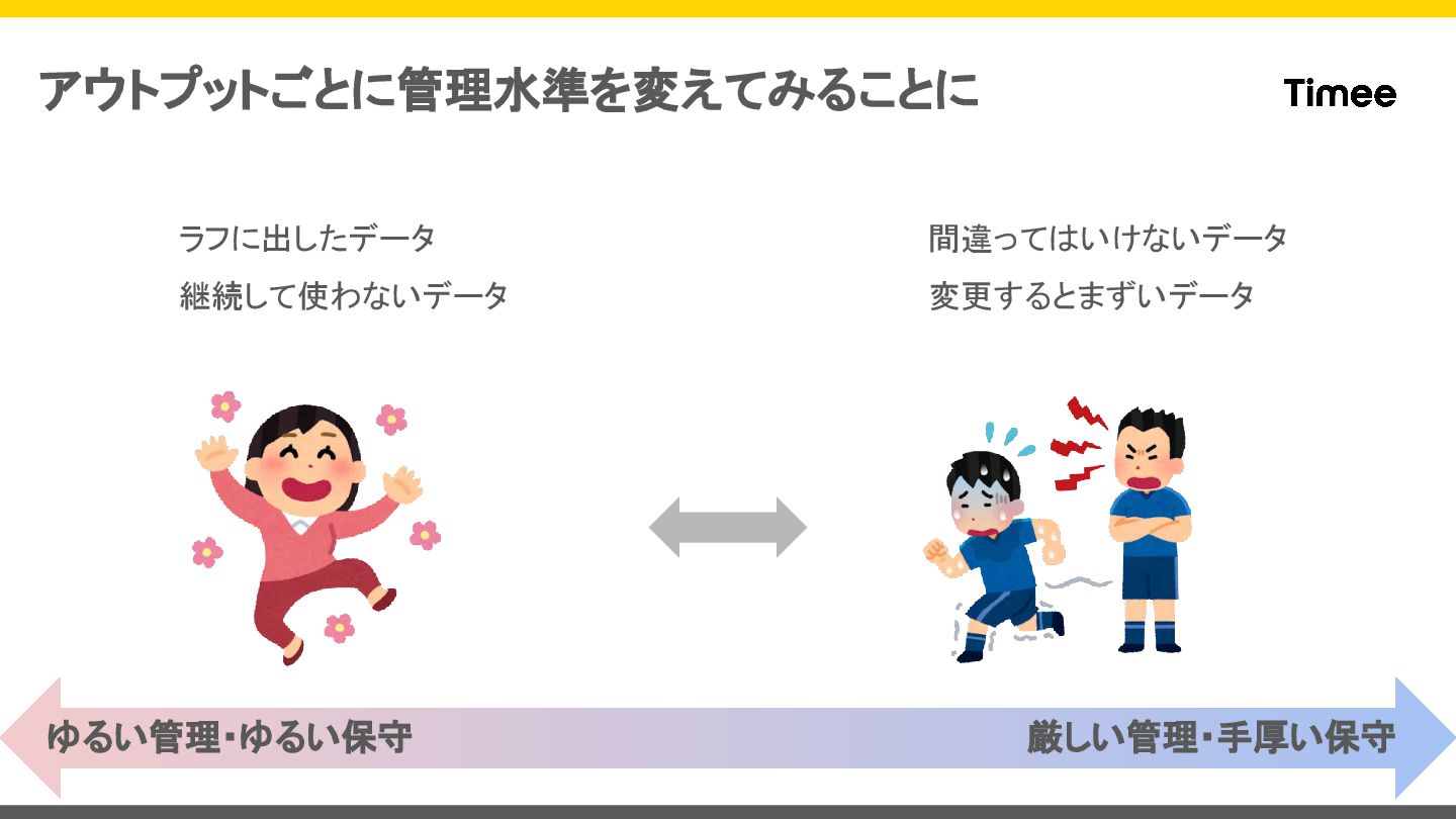 アウトプットごとに管理水準を変えてみることに ラフに出したデータ 継続して使わないデータ 間違ってはいけないデータ 変更するとまずいデータ ゆるい管理・ゆるい保守 厳しい管理・手厚い保守