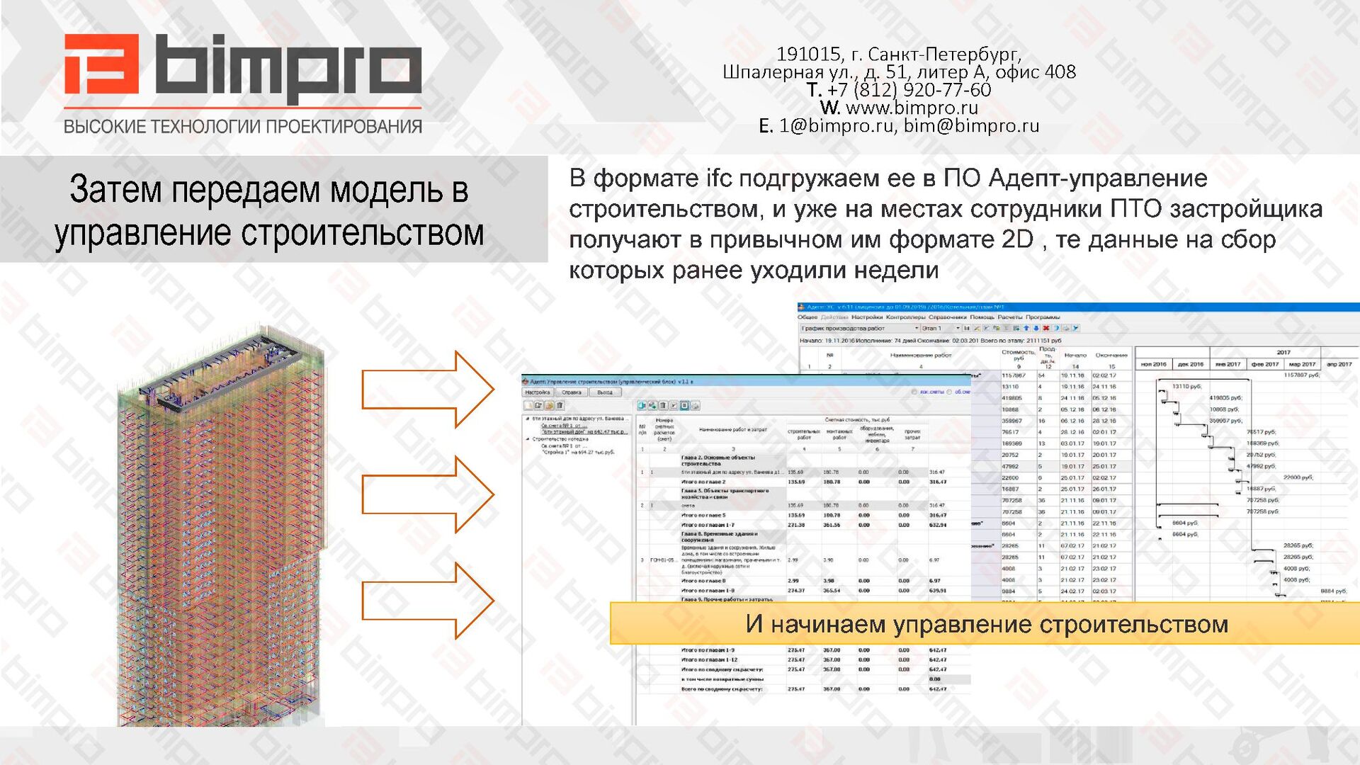 БИМПРО (BIMPRO) на протяжении 10 лет занимается внедрением БИМ (BIM, ТИМ) технологий в строительство. Создание строительных 3D моделей помогает сэкономить до 10% от общей стоимости строительства.