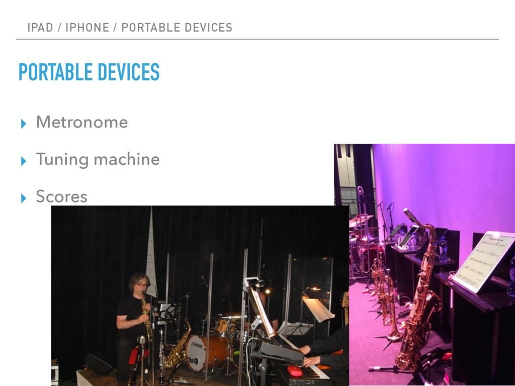 theater (basclar/bari -> fx + wireless system) ▸ arrangements NSJO (notation software) ▸ preparing fado tour (audio file dropbox -> scoring/prct) ▸ recording commercial (recording software) ▸ lecture (keynote)