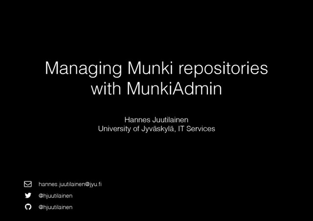 Started in 2010 along with our initial Munki deployment • Designed to complement your current workflow • Doesn't require any configuration or changes to the repository • https://github.com/hjuutilainen/munkiadmin