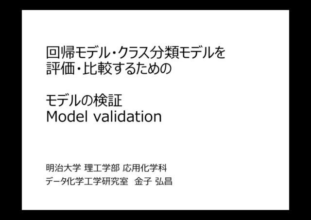 “良い”回帰モデル・クラス分類モデルとは何か? データセットの呼び方 比較指標 回帰分析 決定係数 r2 回帰分析 RMSE 回帰分析 MAE クラス分類 混同行列・正解率・精度・検出率 クラス分類 Kappa係数 モデルの評価・比較 ハイパーパラメータの決定 どのようなハイパーパラメータを用いるか? クロスバリデーション クロスバリデーションの補足 どのようにデータセットを分けるか? Y-randomization (Yランダマイゼイション)