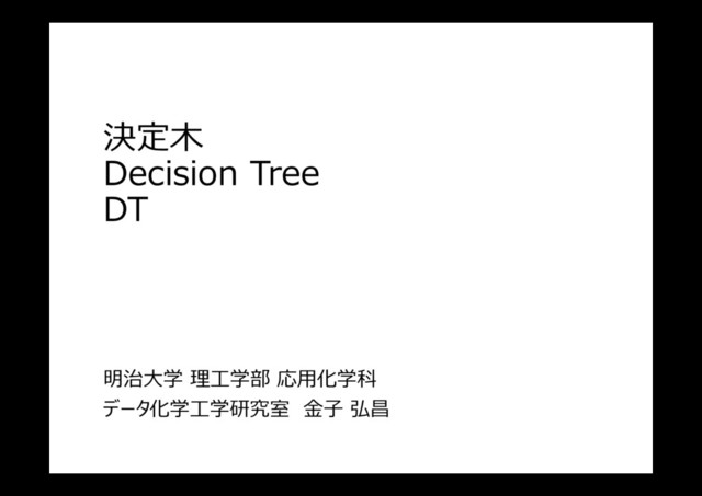 決定木 (Decision Tree, DT) とは? 決定木でできることのイメージ (回帰分析) 決定木のでできることのイメージ (クラス分類) 決定木モデルの木構造 (回帰分析) 決定木モデルの木構造 (クラス分類) 決定木のアルゴリズム 回帰分析における評価関数 E クラス分類における評価関数 E いつ木の成長を止めるか?