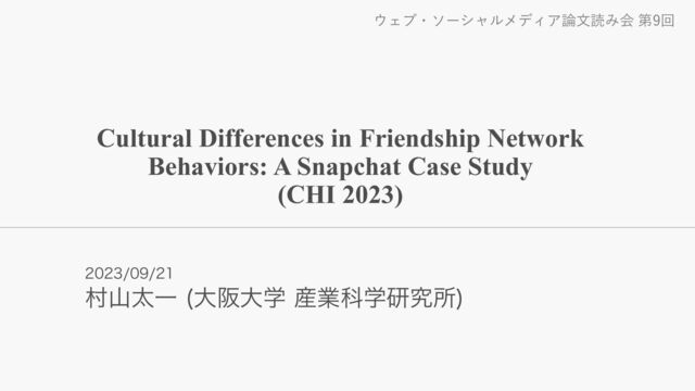 Case Study (CHI 2023) Agrima Seth (University of Michigan), Jiyin Cao (Stony Brook University), Xiaolin Shi (Snap Inc.), Ron Dotsch (Snap Inc.), Yozen Liu (Snap Inc.), Maarten W. Bos (Snap Inc.) l Human Computer Interaction研究のトップカンファレンスの1つであるThe ACM CHI Conference on Human Factors in Computing Systems 2023で発表 l Computational Social ScienceΛઐʹ͢ΔϛγΨϯେͷതֶ࢜ੜAgrima SethࢯͱSnap Inc.ࣾͱ ͷݚڀ l ͲΜͳจʁ 4OBQ*ODࣾͷσʔλΛ༻͍ͯɺࠃՈͷจԽ͕4/4্Ͱܗ͞ΕΔ༑ਓωοτϫʔΫߏʹͲͷΑ͏ͳӨڹΛ༩ ͑Δ͔ɺίϯςϯπͷফඅʹͲͷΑ͏ͳӨڹΛ༩͑Δͷ͔Λ໌Β͔ʹ͢Δ l จબͷཧ༝ɻ Χࠃͷ4/4σʔλͱ֤ࠃͷจԽʹؔ͢Δ౷ܭσʔλΛ༻͍ͯɺࠃՈؒͷൺֱΛେنʹऔΓΜͰ͍Δͷ͕໘ന ͍ɻ͜͏͍͏ݚڀ͕ࠓޙ૿͍͖͑ͯͦ͏ɻ