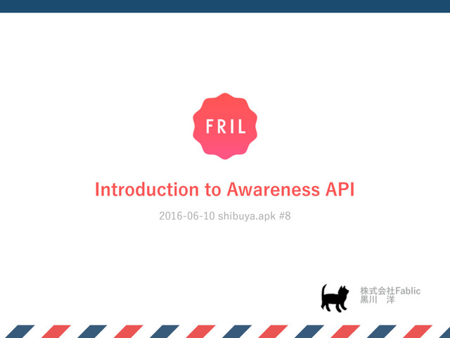In this talk, I'm explaining about Awareness API based on a Google I/O session - Introducing the Awareness API, an easy way to make your apps context aware (https://www.youtube.com/watch?v=37ia7S4Lsv4)