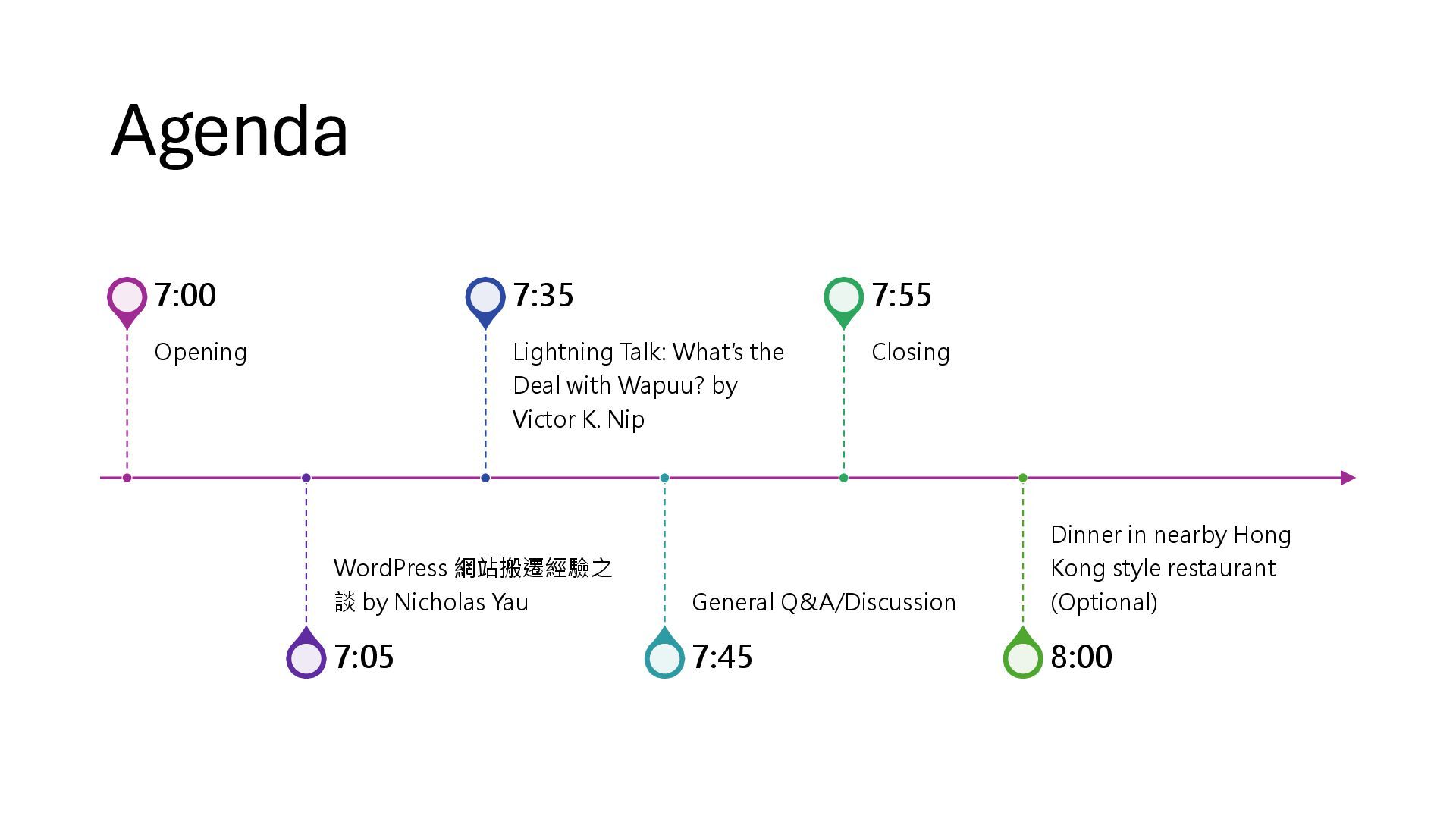 1. Agenda Opening 7:00 WordPress 網站搬遷經驗之 談 by Nicholas Yau 7:05