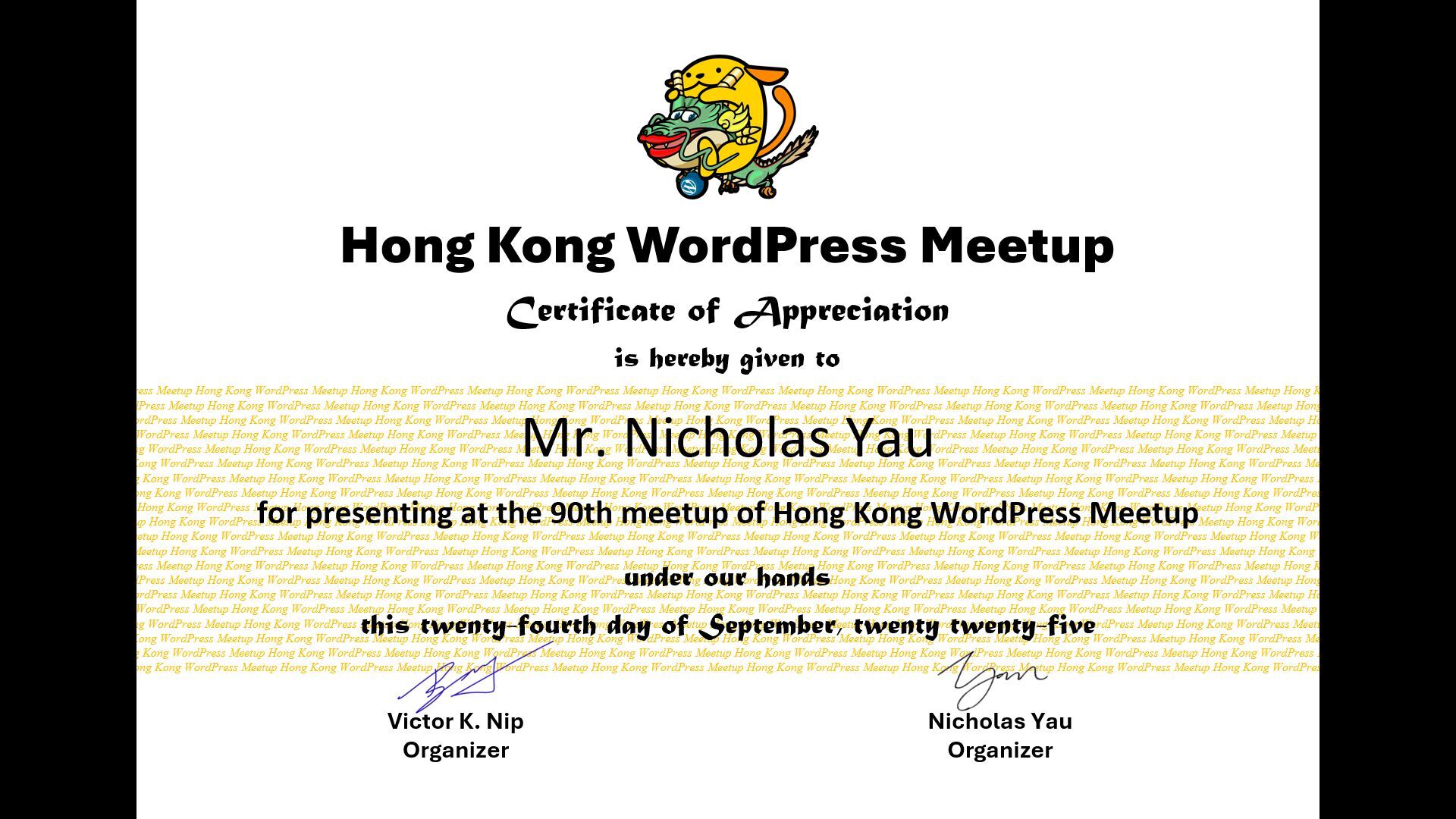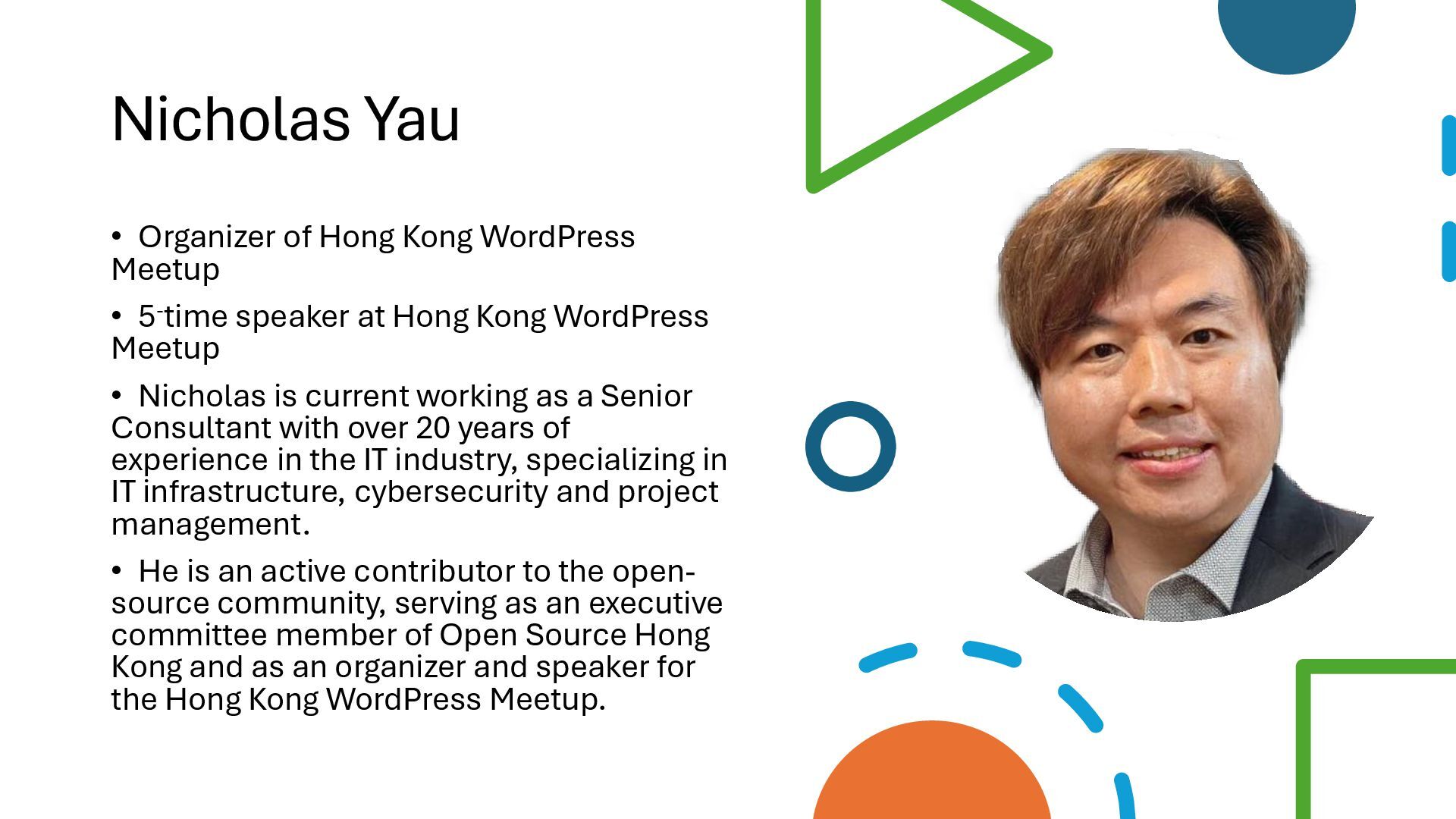 5-time speaker at Hong Kong WordPress Meetup • Nicholas is current working as a Senior Consultant with over 20 years of experience in the IT industry, specializing in IT infrastructure, cybersecurity and project management. • He is an active contributor to the open- source community, serving as an executive committee member of Open Source Hong Kong and as an organizer and speaker for the Hong Kong WordPress Meetup.
