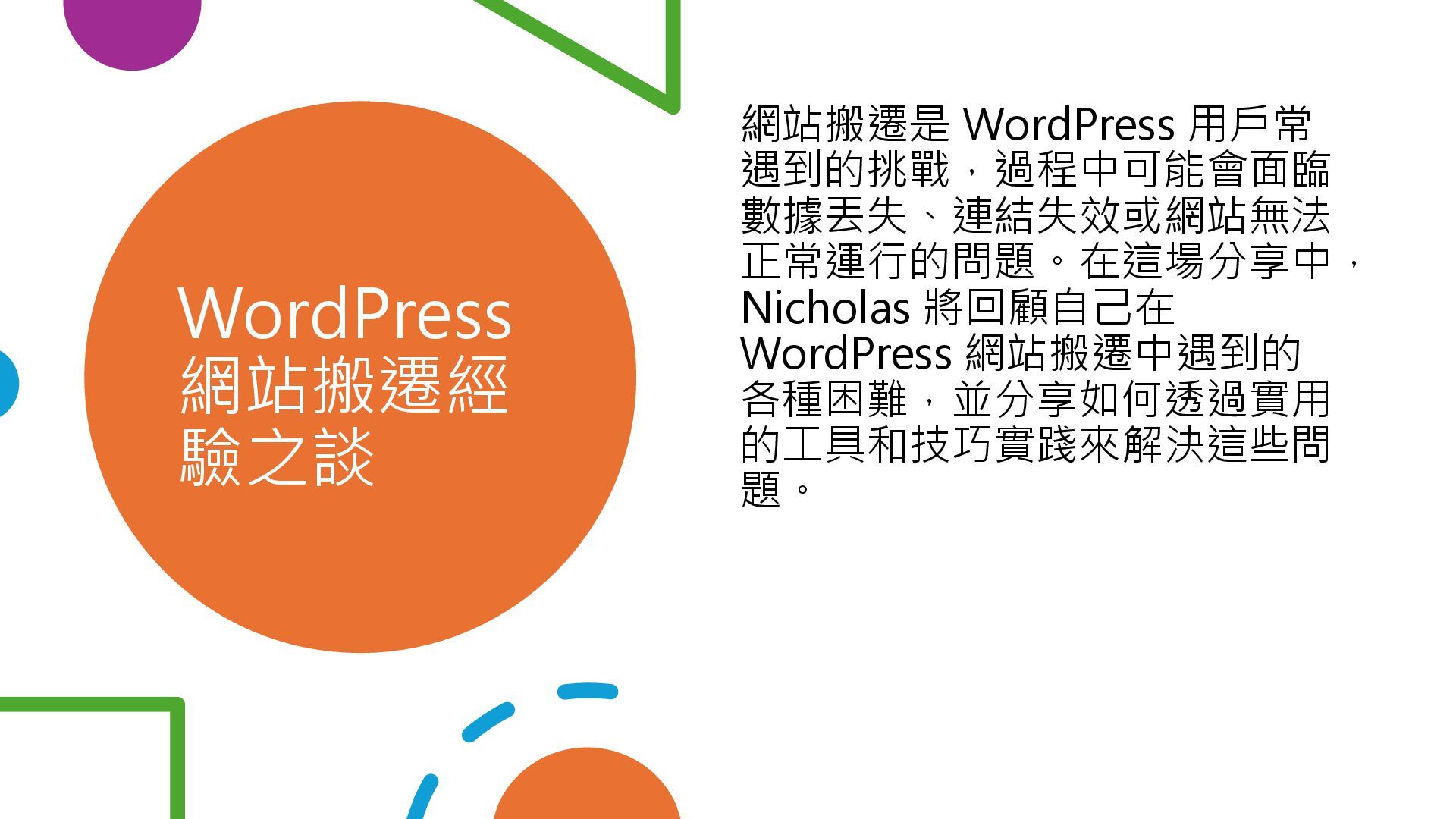 6. WordPress 網站搬遷經 驗之談 網站搬遷是 WordPress 用戶常 遇到的挑戰,過程中可能會面臨 數據丟失、連結失效或網站無法 正常運行的問題。在這場分享中, Nicholas