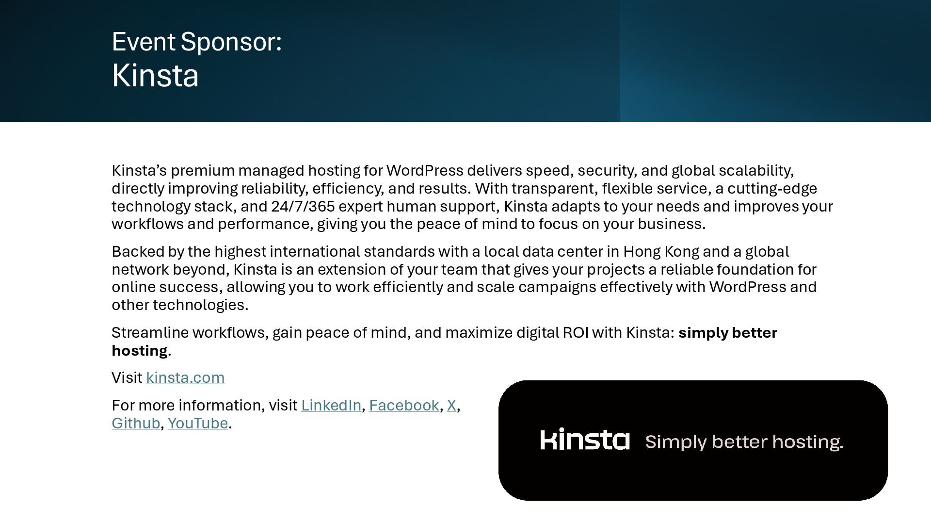 speed, security, and global scalability, directly improving reliability, efficiency, and results. With transparent, flexible service, a cutting-edge technology stack, and 24/7/365 expert human support, Kinsta adapts to your needs and improves your workflows and performance, giving you the peace of mind to focus on your business. Backed by the highest international standards with a local data center in Hong Kong and a global network beyond, Kinsta is an extension of your team that gives your projects a reliable foundation for online success, allowing you to work efficiently and scale campaigns effectively with WordPress and other technologies. Streamline workflows, gain peace of mind, and maximize digital ROI with Kinsta: simply better hosting. Visit kinsta.com For more information, visit LinkedIn, Facebook, X, Github, YouTube.