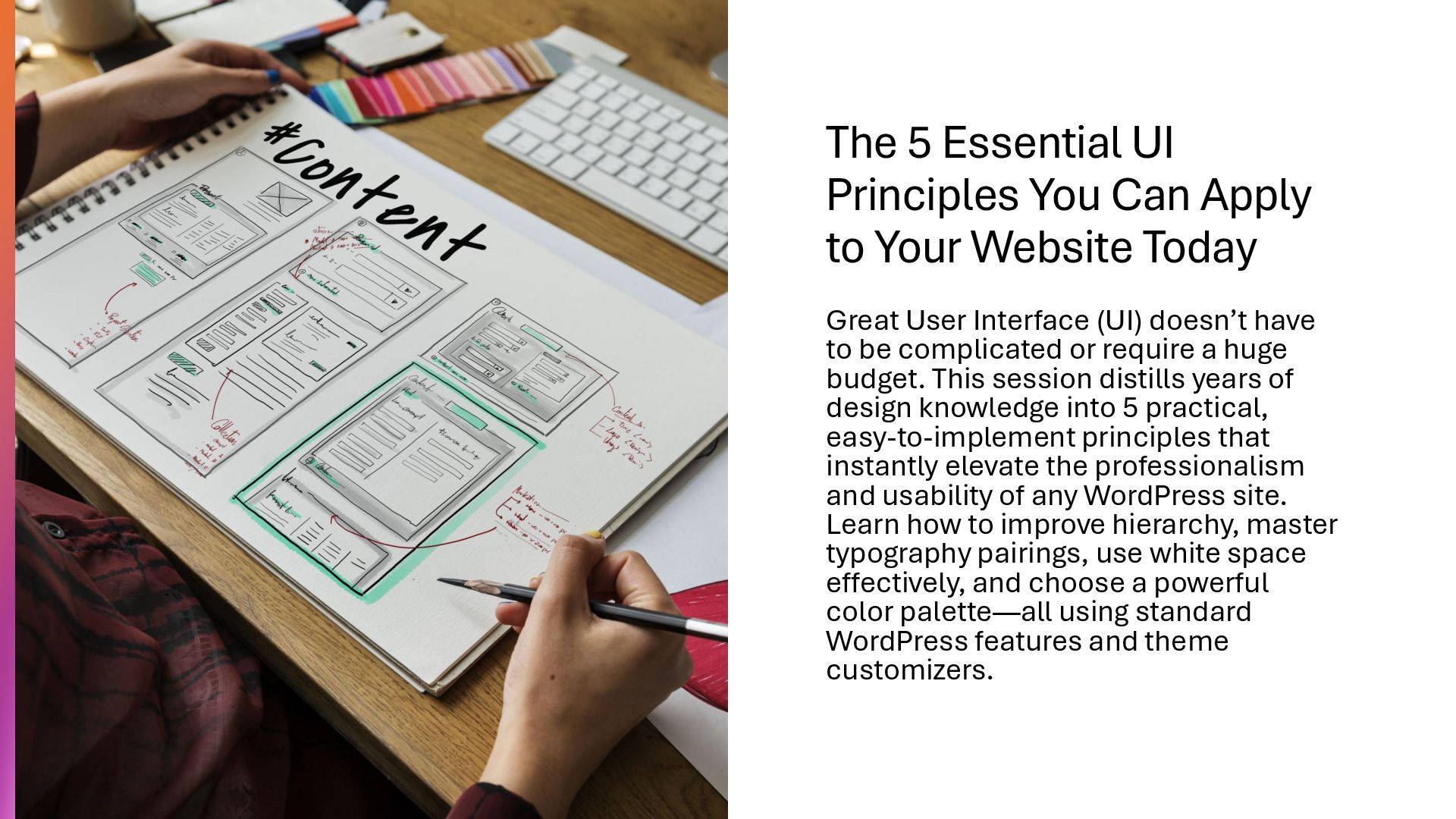 Website Today Great User Interface (UI) doesn’t have to be complicated or require a huge budget. This session distills years of design knowledge into 5 practical, easy-to-implement principles that instantly elevate the professionalism and usability of any WordPress site. Learn how to improve hierarchy, master typography pairings, use white space effectively, and choose a powerful color palette—all using standard WordPress features and theme customizers.
