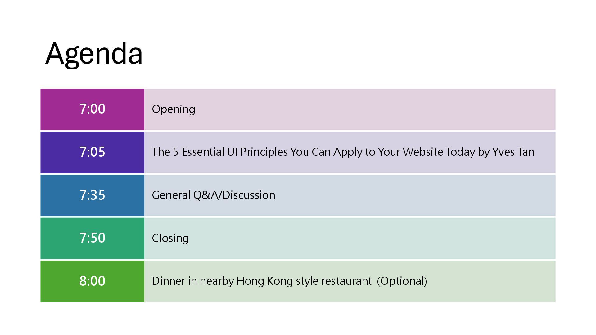 1. Agenda Opening 7:00 The 5 Essential UI Principles You Can