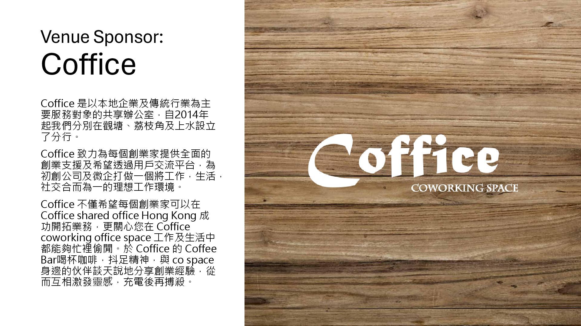 3. Venue Sponsor: Coffice Coffice 是以本地企業及傳統行業為主 要服務對象的共享辦公室,自2014年 起我們分別在觀塘、荔枝角及上水設立 了分行。 Coffice 致力為每個創業家提供全面的