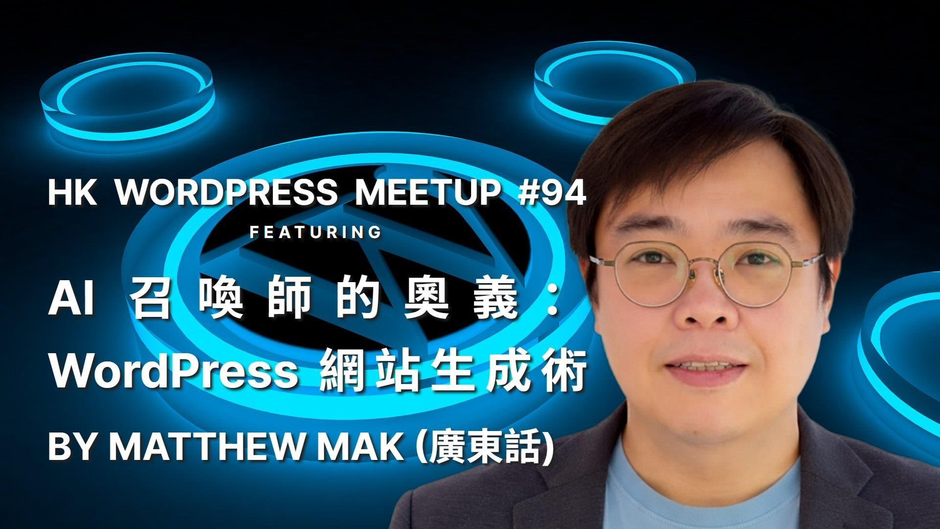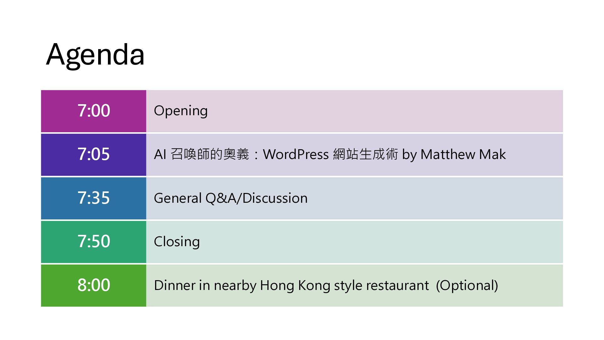 1. Agenda Opening 7:00 AI 召喚師的奧義:WordPress 網站生成術 by Matthew Mak 7:05