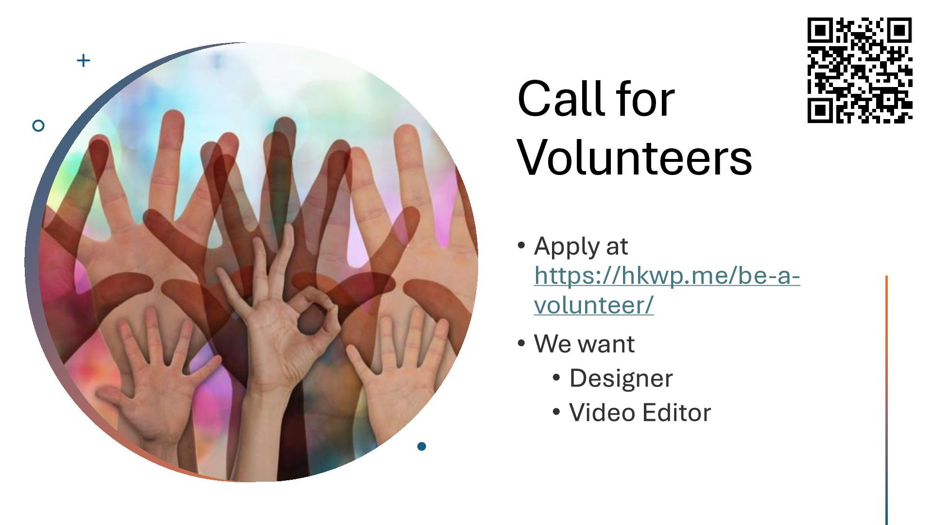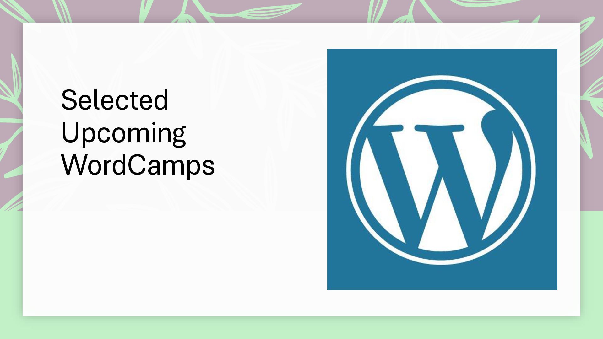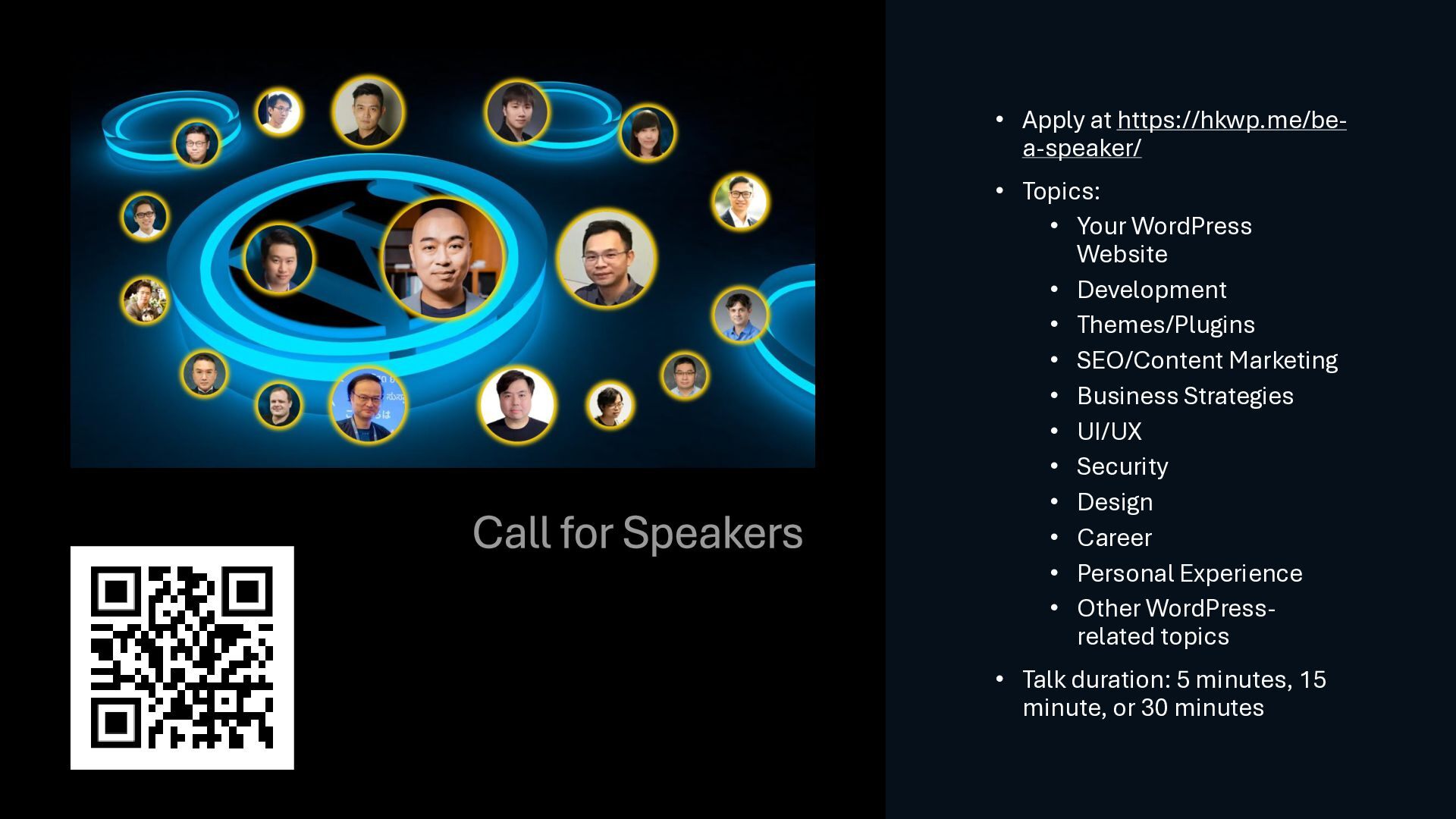 Website • Development • Themes/Plugins • SEO/Content Marketing • Business Strategies • UI/UX • Security • Design • Career • Personal Experience • Other WordPress- related topics • Talk duration: 5 minutes, 15 minute, or 30 minutes