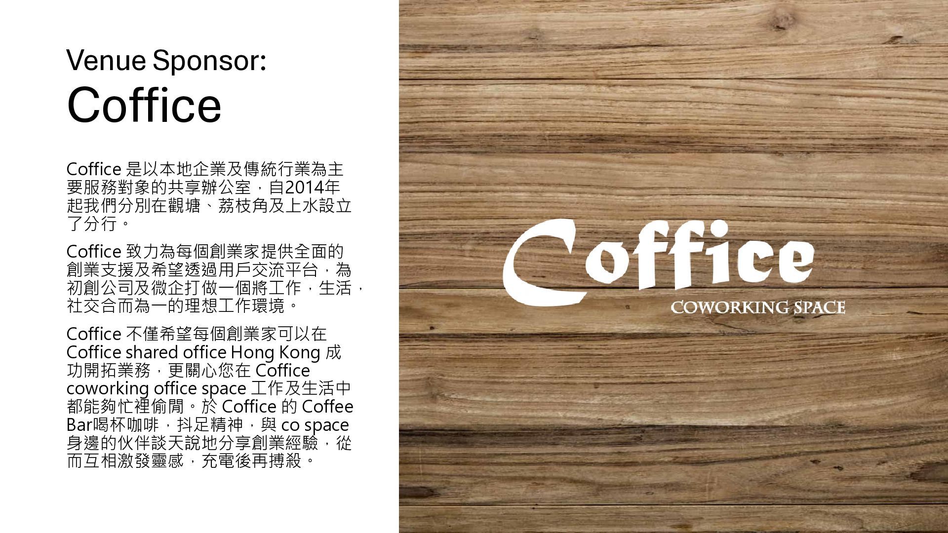 9. Venue Sponsor: Coffice Coffice 是以本地企業及傳統行業為主 要服務對象的共享辦公室,自2014年 起我們分別在觀塘、荔枝角及上水設立 了分行。 Coffice 致力為每個創業家提供全面的