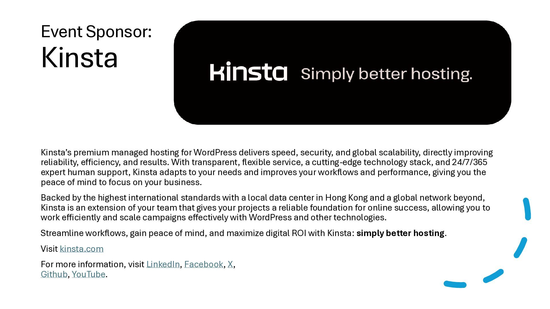 speed, security, and global scalability, directly improving reliability, efficiency, and results. With transparent, flexible service, a cutting-edge technology stack, and 24/7/365 expert human support, Kinsta adapts to your needs and improves your workflows and performance, giving you the peace of mind to focus on your business. Backed by the highest international standards with a local data center in Hong Kong and a global network beyond, Kinsta is an extension of your team that gives your projects a reliable foundation for online success, allowing you to work efficiently and scale campaigns effectively with WordPress and other technologies. Streamline workflows, gain peace of mind, and maximize digital ROI with Kinsta: simply better hosting. Visit kinsta.com For more information, visit LinkedIn, Facebook, X, Github, YouTube.