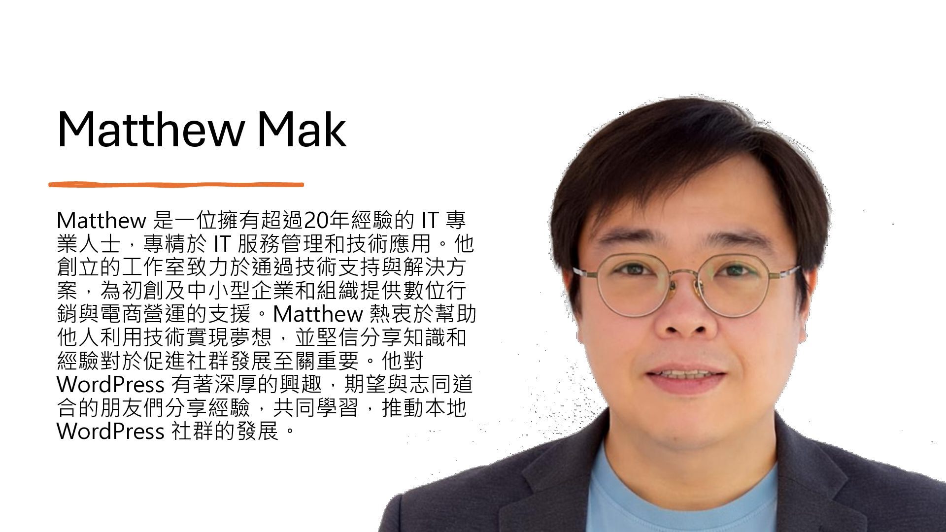 案,為初創及中小型企業和組織提供數位行 銷與電商營運的支援。Matthew 熱衷於幫助 他人利用技術實現夢想,並堅信分享知識和 經驗對於促進社群發展至關重要。他對 WordPress 有著深厚的興趣,期望與志同道 合的朋友們分享經驗,共同學習,推動本地 WordPress 社群的發展。