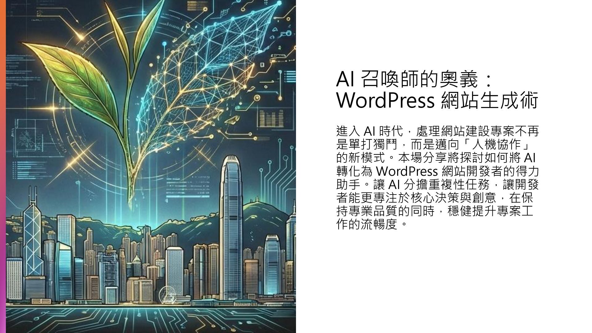 5. AI 召喚師的奧義: WordPress 網站生成術 進入 AI 時代,處理網站建設專案不再 是單打獨鬥,而是邁向「人機協作」 的新模式。本場分享將探討如何將 AI
