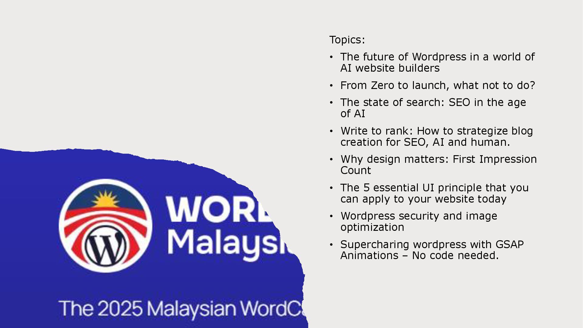 AI website builders • From Zero to launch, what not to do? • The state of search: SEO in the age of AI • Write to rank: How to strategize blog creation for SEO, AI and human. • Why design matters: First Impression Count • The 5 essential UI principle that you can apply to your website today • Wordpress security and image optimization • Supercharing wordpress with GSAP Animations – No code needed.