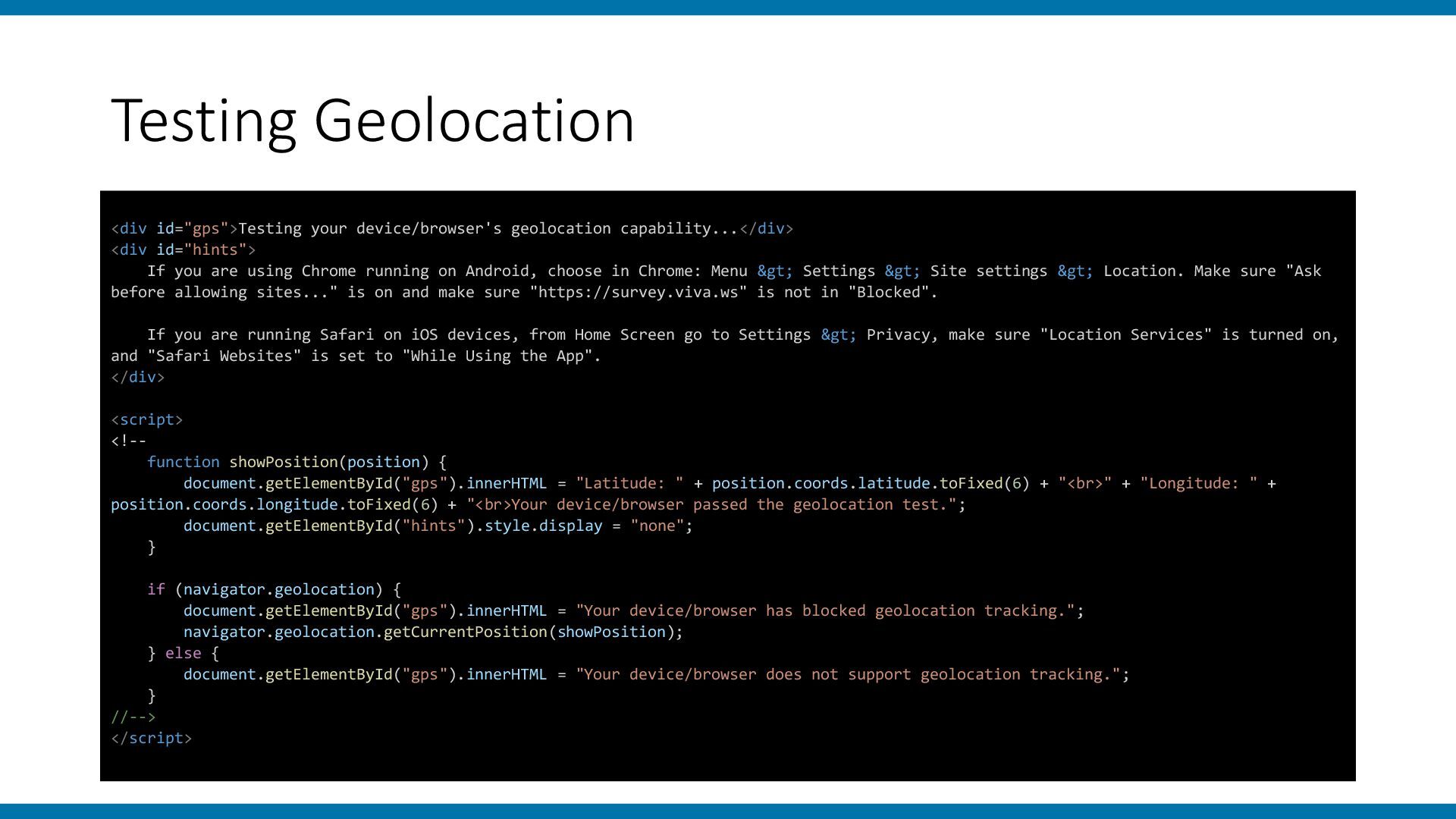 If you are using Chrome running on Android, choose in Chrome: Menu > Settings > Site settings > Location. Make sure "Ask before allowing sites..." is on and make sure "https://survey.viva.ws" is not in "Blocked". If you are running Safari on iOS devices, from Home Screen go to Settings > Privacy, make sure "Location Services" is turned on, and "Safari Websites" is set to "While Using the App". </div> <script> <!-- function showPosition(position) { document.getElementById("gps").innerHTML = "Latitude: " + position.coords.latitude.toFixed(6) + "<br>" + "Longitude: " + position.coords.longitude.toFixed(6) + "<br>Your device/browser passed the geolocation test."; document.getElementById("hints").style.display = "none"; } if (navigator.geolocation) { document.getElementById("gps").innerHTML = "Your device/browser has blocked geolocation tracking."; navigator.geolocation.getCurrentPosition(showPosition); } else { document.getElementById("gps").innerHTML = "Your device/browser does not support geolocation tracking."; } //--> </script>