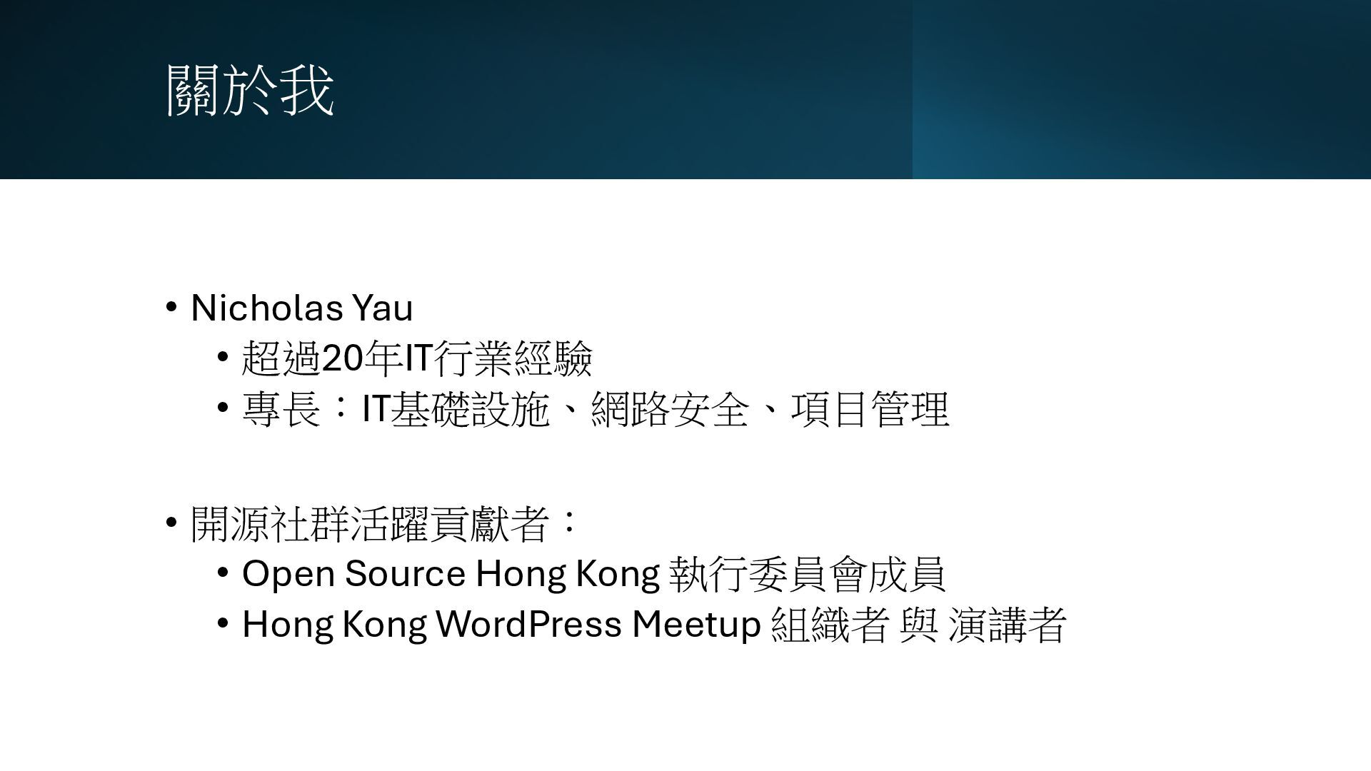 關於我 • Nicholas Yau • 超過20年IT行業經驗 • 專長:IT基礎設施、網路安全、項目管理 • 開源社群活躍貢獻者: